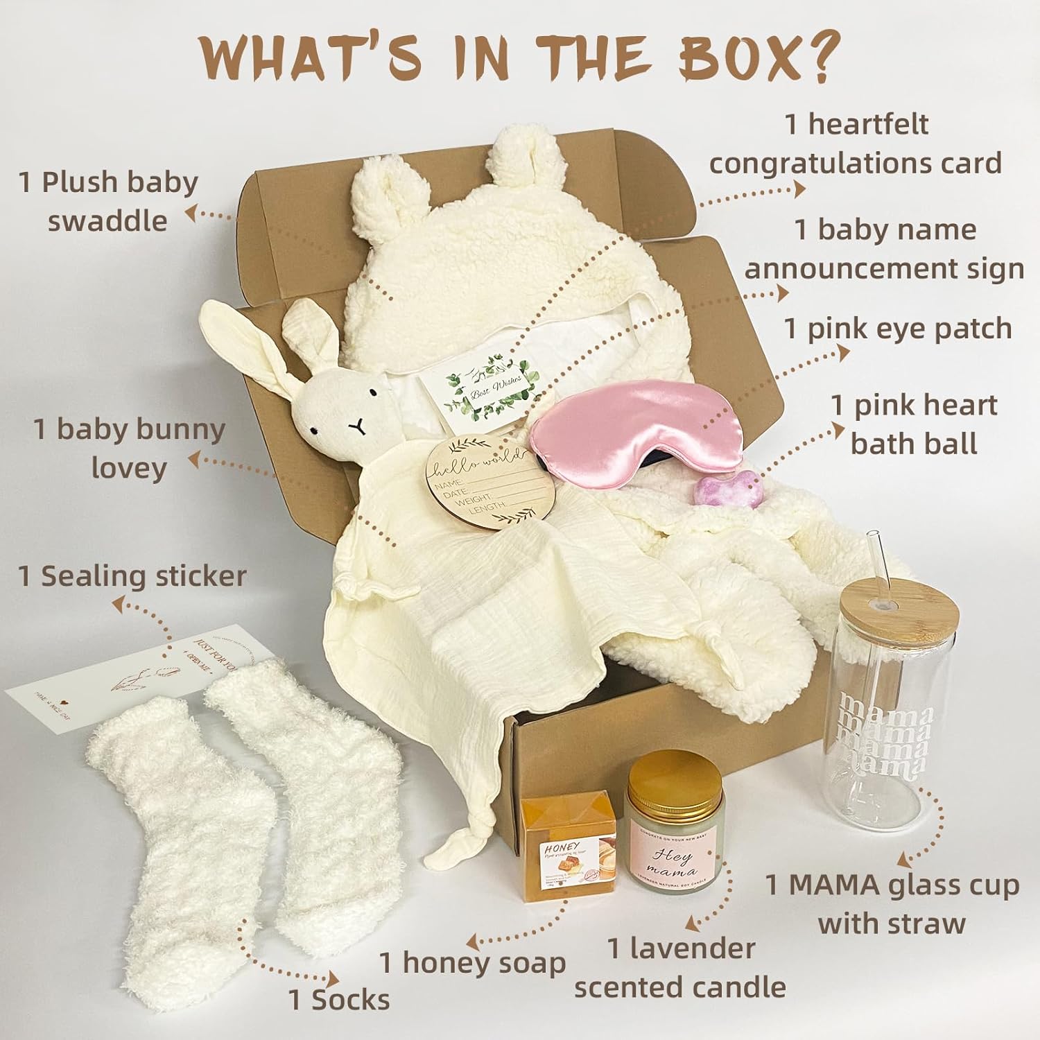 The gift box is filled with 1* MAMA glass cups, 1* Bunny cutie, 1* Baby swaddle blanket, 1* lavender-scented candles, 1* bath bomb, 1* Honey soap, 1* Congratulations card, 1* fleece socks, 1* eye mask, 1* Sticker, 1* Toilette. You will love this fun new Mom gift guide.