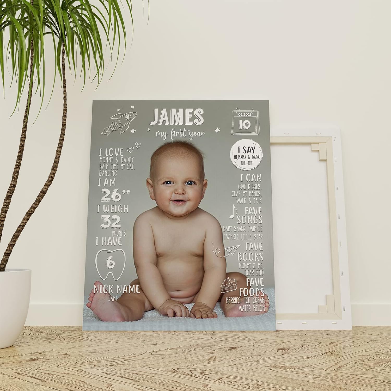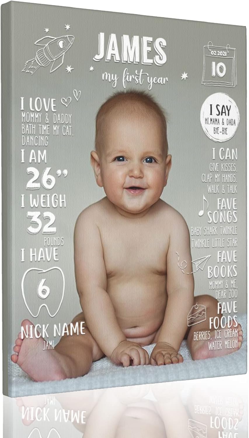 Unique and Personalized: Celebrate your baby’s first birthday with a custom milestone framed canvas featuring your child’s photo and personalized details, making it a one-of-a-kind keepsake that captures the precious moments of their first year。