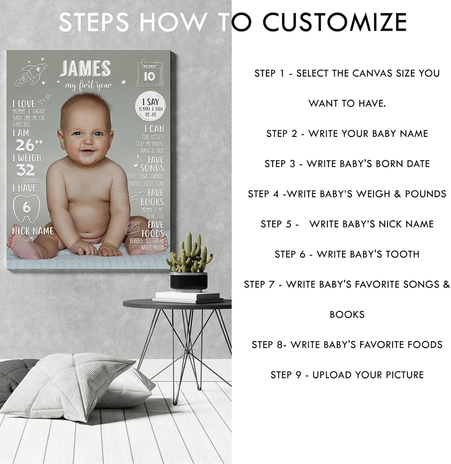 – Personalized first birthday milestone framed canvas with your baby’s photo and details