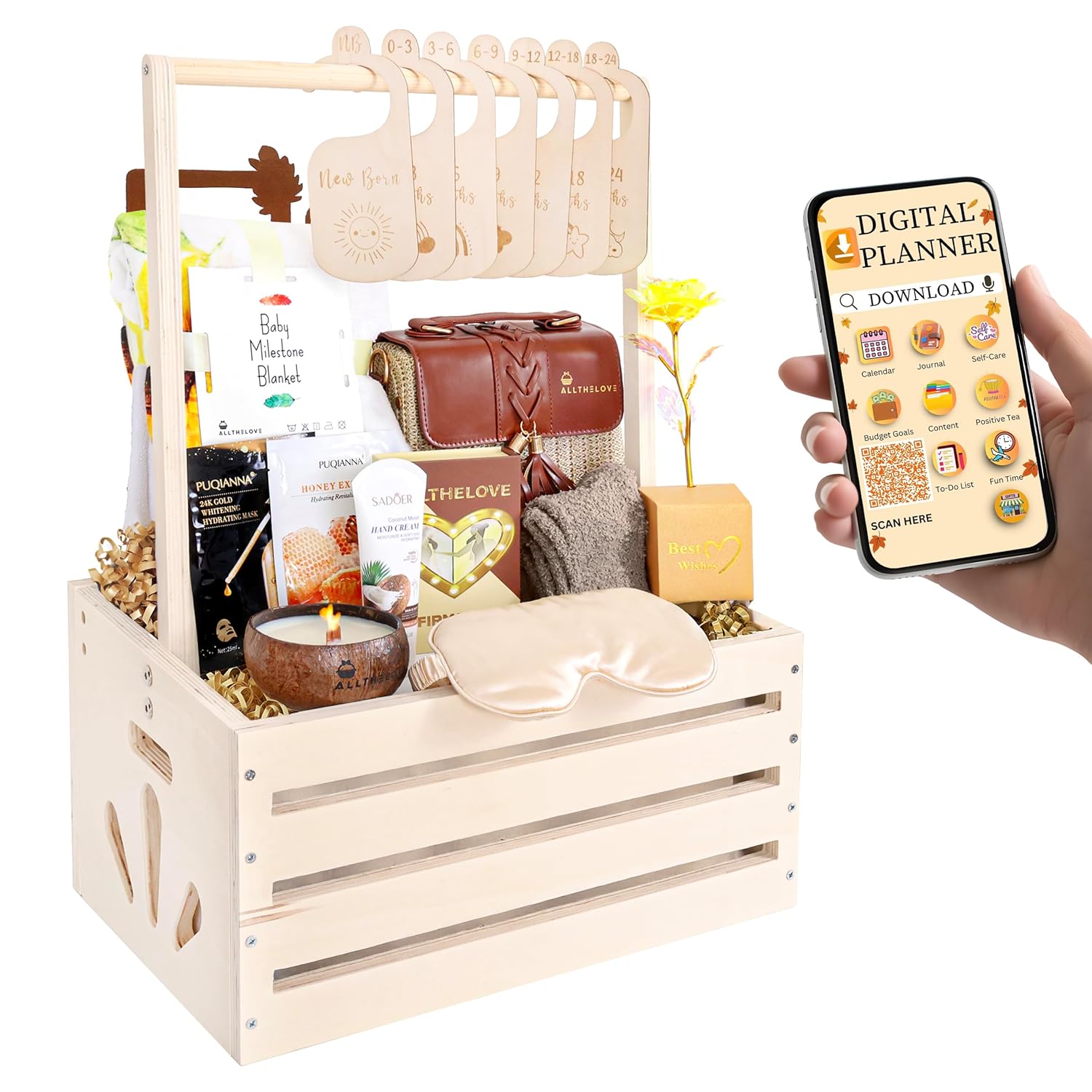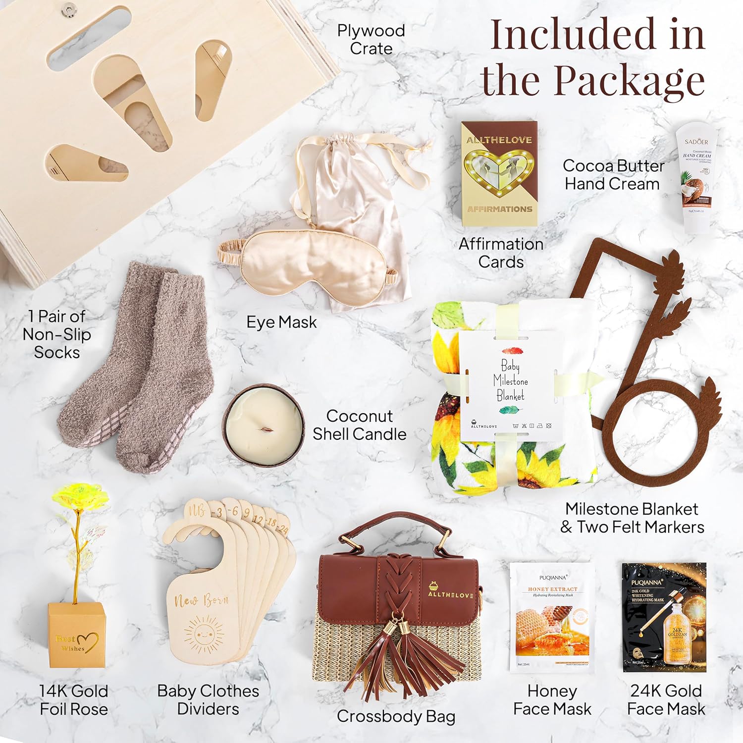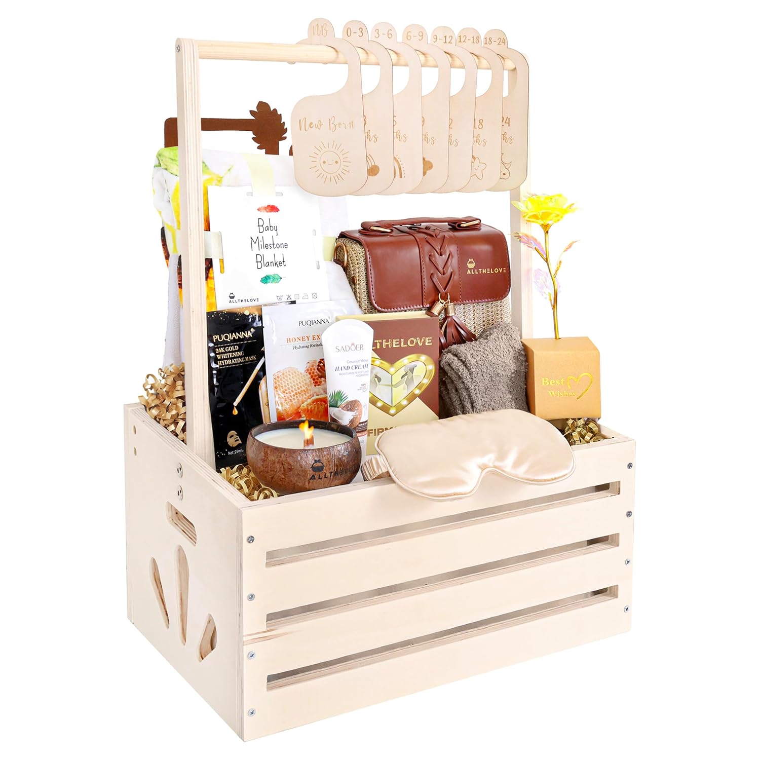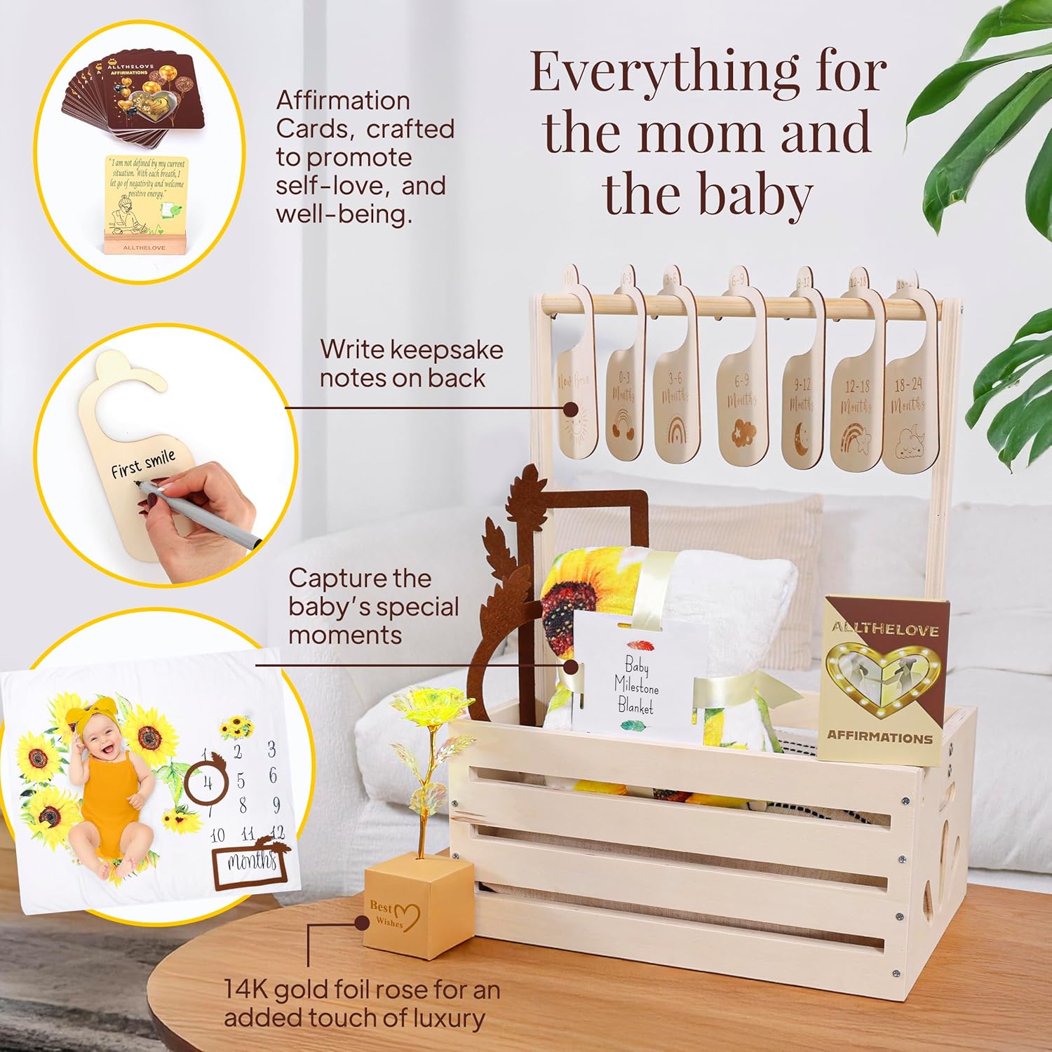 PREMIUM GIFT SET FOR NEW MOMS: Carefully curated to pamper new moms, this luxury set includes self-care essentials, a milestone blanket, and keepsake wooden crate. Every item is functional, making this the perfect postpartum or baby shower gift for relaxation and support.