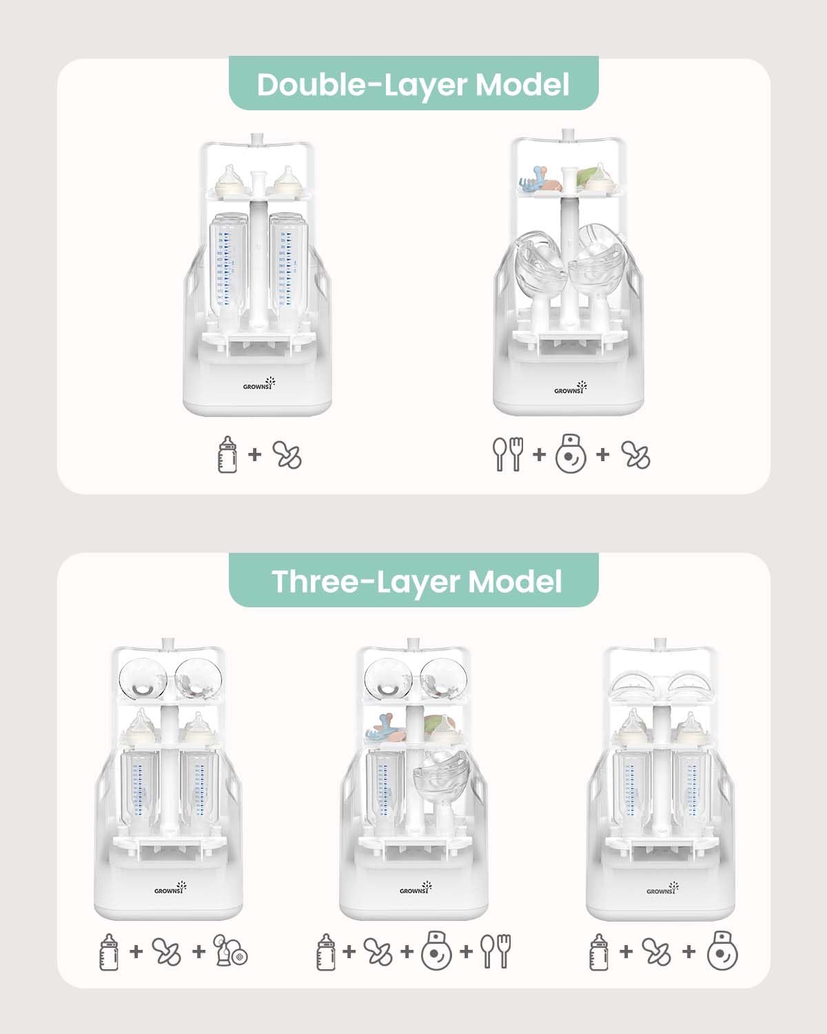 𝟑-𝐋𝐚𝐲𝐞𝐫 𝐄𝐱𝐭𝐫𝐚-𝐋𝐚𝐫𝐠𝐞 𝐂𝐚𝐩𝐚𝐜𝐢𝐭𝐲 – Designed for busy parents, the Grownsy baby bottle sterilizer and dryer easily holds 6 to 12 bottles of any brands/sizes, along with breast pump parts, pacifiers, teethers, and more. Its spacious three-layer design allows you to tackle large batches of baby items in one go, clean more in less time.