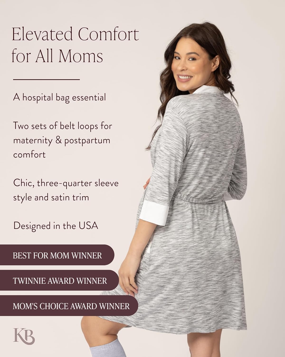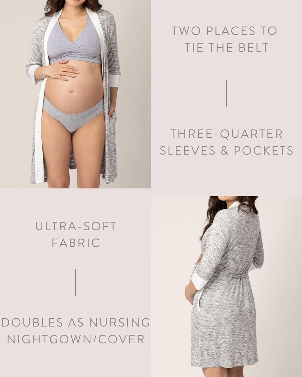 Customers find the maternity robe soft, comfortable, and well-fitting throughout pregnancy, with three-quarter length sleeves that cover everything. They appreciate its lightweight, mid-weight material, quality, and style, with one customer noting the nice satin accents. The robe is particularly suitable for postpartum wear, and one customer mentions it works well as a hospital and breastfeeding gown. The material thickness receives mixed feedback, with several customers noting it’s super thin.