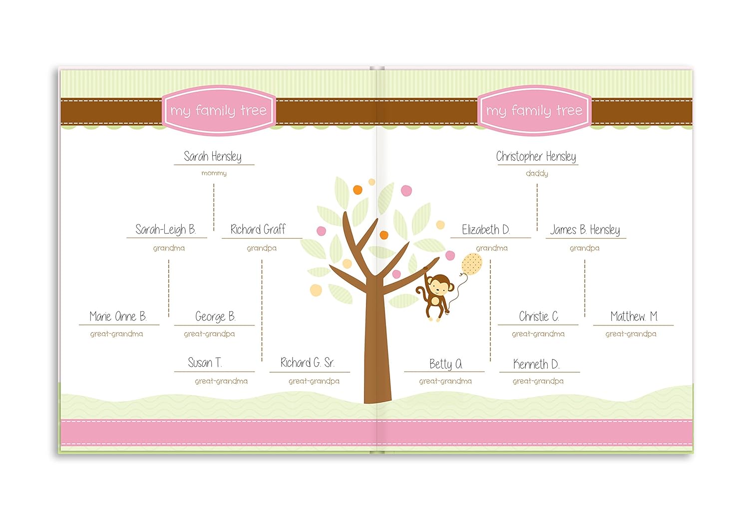 Pages include: who the book belongs to, baby’s introduction, about mommy and daddy, mommy and daddy’s story, my family tree, mommy’s pregnancy journey, doctor visits, my baby shower, gift and guest list