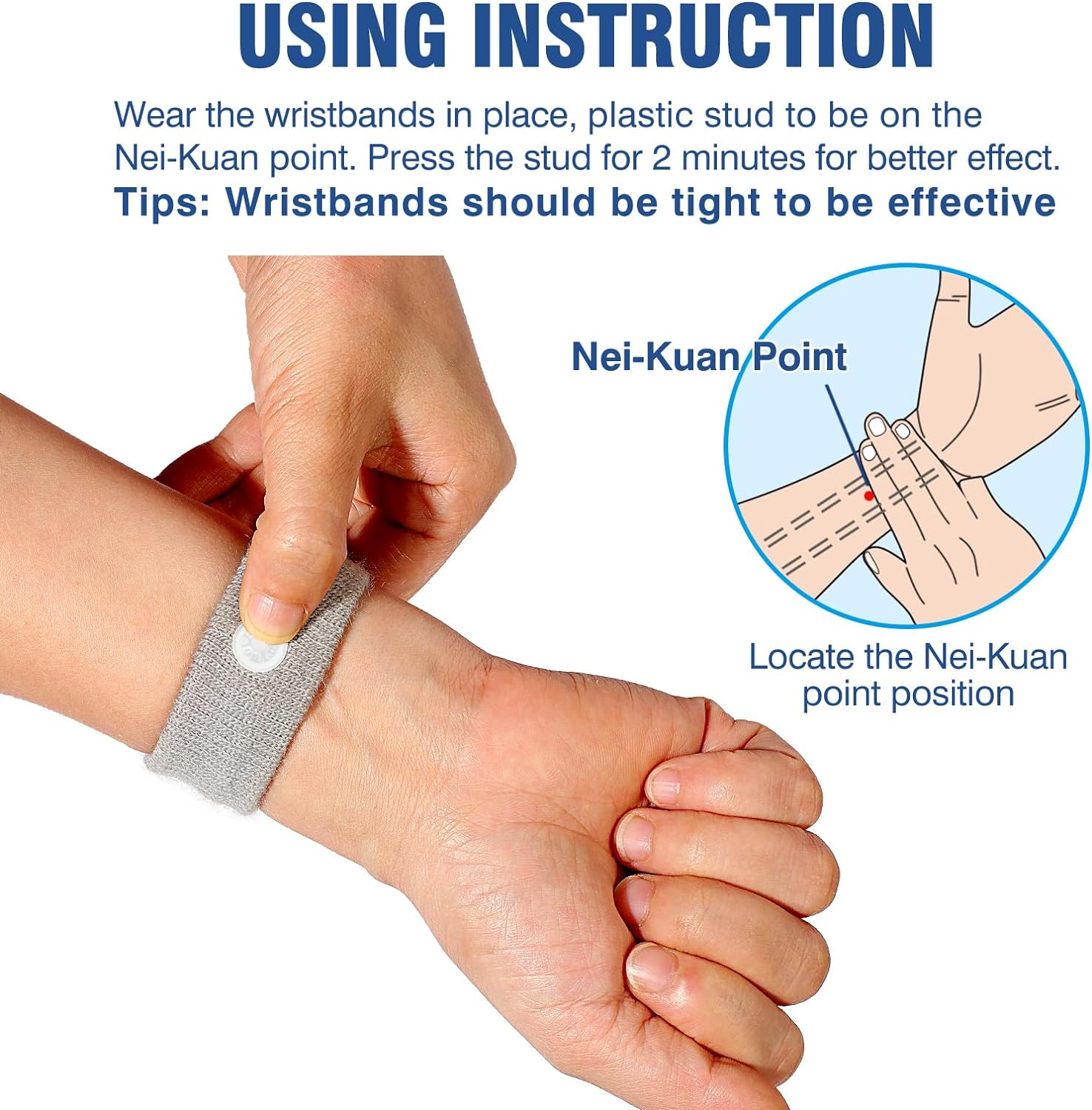 ACUPRESSURE TREATMENT: Acupressure wristband works by exerting pressure on the Nei-Kuan point (accupressure point 6) and stimulates it through the plastic stud on the wristband. The plastic stud need to be placed exactly on the Nei-Kuan point which is in between the two wrist tendons, three fingers from crease of wrist. After wearing, press the stud for 2 minutes for better effect. Always wear both wristbands, and wristbands should be tight to be effective.
