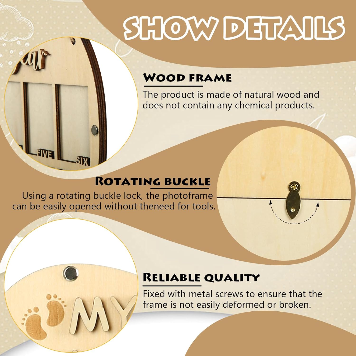 SIZE & MATERIAL: My first year milestone board size 11.9″ high x 13.4″ wide, made from 2/5″ thick premium wood,smooth and reusable,not easy to fade or peel.fits 1.8″ x 3″ photos (Wallet Size),easy to use.