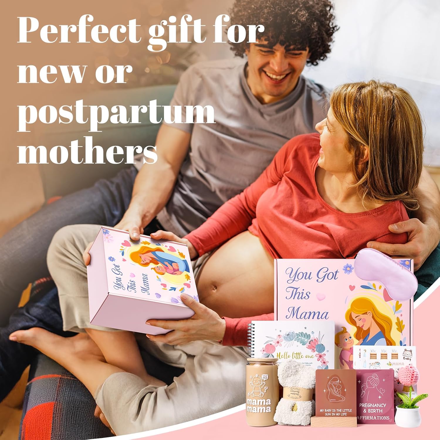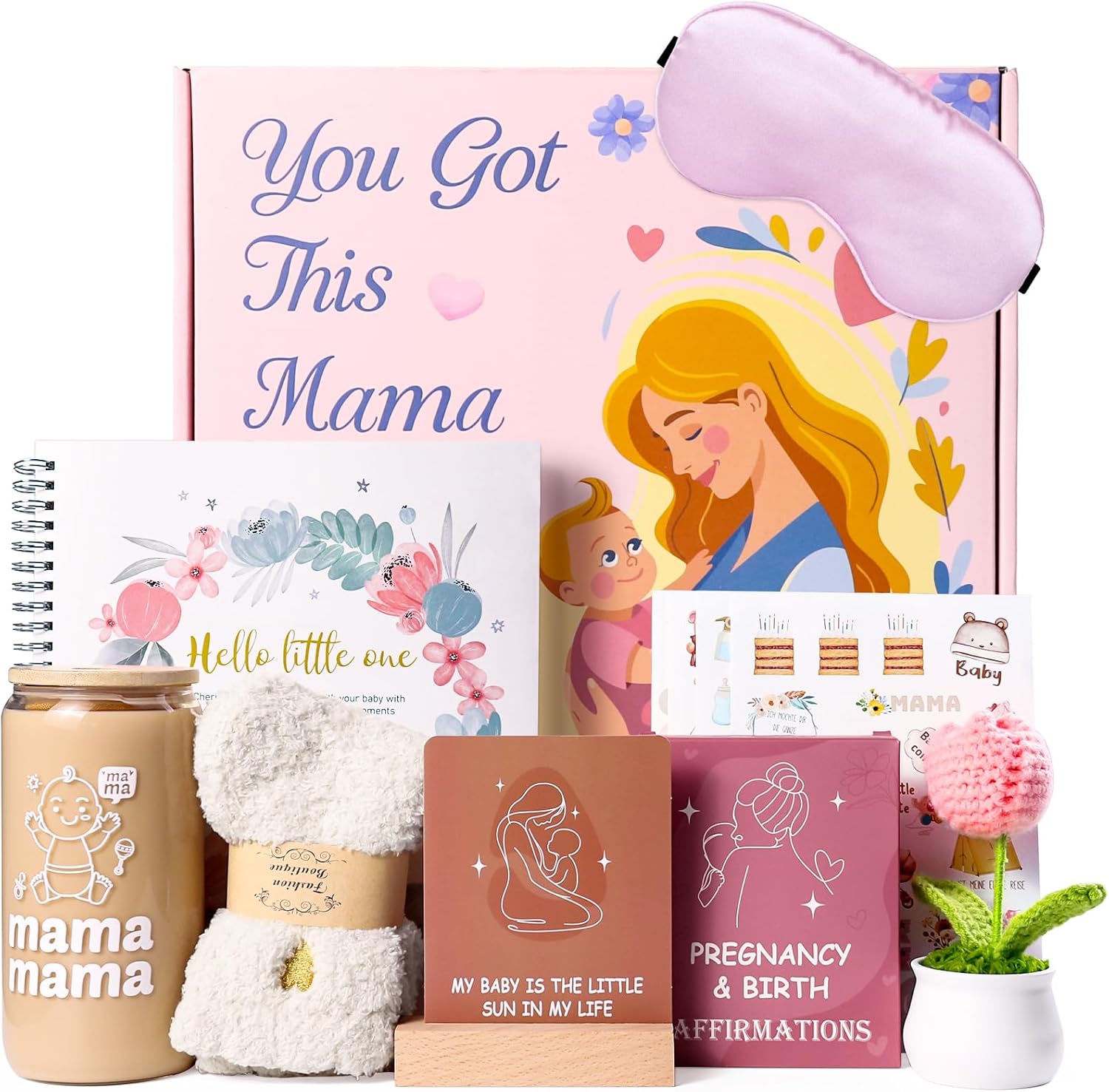 New Mom Gift Box: 1 *baby memory book set,50 *Affirmation Cards,1* lovely glass cup, 1* Eye mask, 1 *pair of cozy socks, 1* Knitted tulip, and 1 beautifully packaged gift box package. A unique gift that will sure to make her feel cherished and loved.