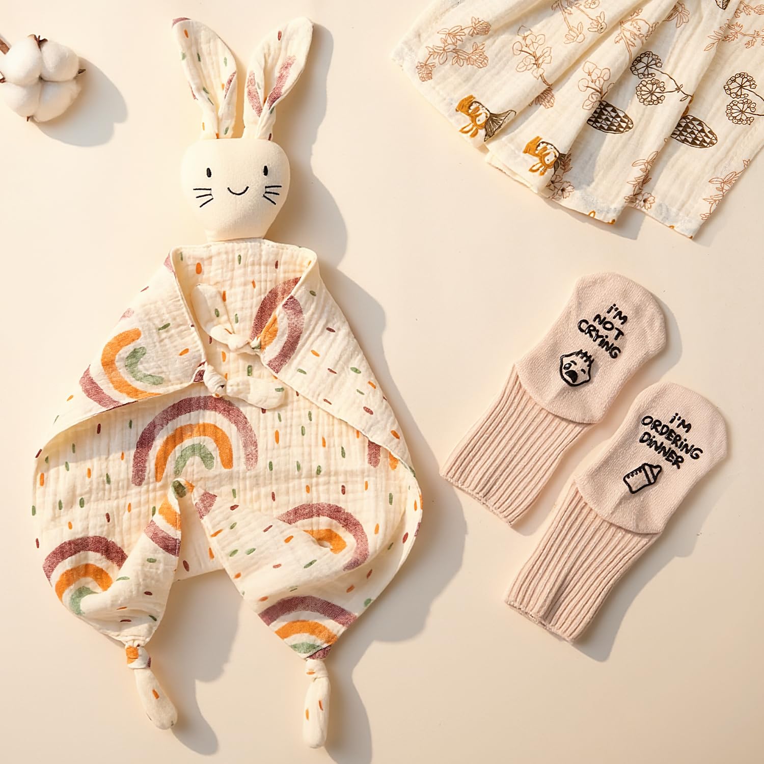 Care Package for New Mama: Pamper the newborn with ultra-soft, practical essentials a breathable baby bath towel for cozy snuggles, bunny lovey for comfort, and non-slip baby socks to keep tiny feet warm. Each item is made from gentle, skin-friendly materials to ensure baby’s comfort and safety.