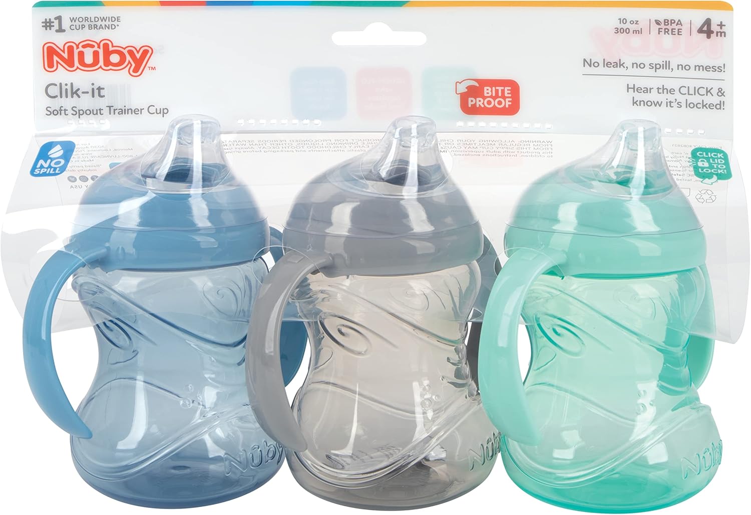 SIPPY CUP FOR KIDS 4+ MONTHS: Nuby’s Clik-It No-Spill Soft Spout Sippy Cup holds up to 10 ounces (300 ml) of water, milk, or juice; It’s the perfect cup for spill-prone babies at home or on the go