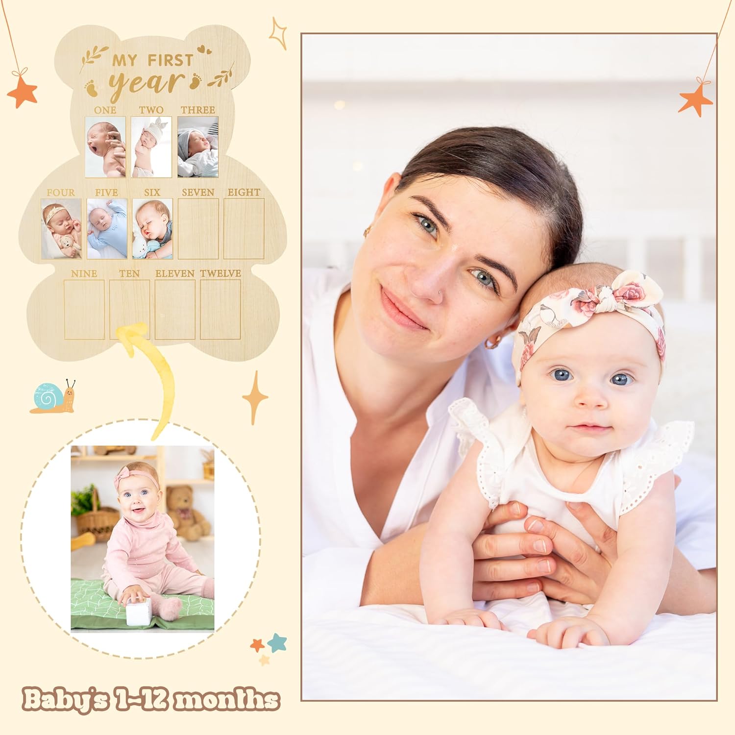 R HORSE My First Year Photo Display Wood Board, Baby’s First Year Picture Frame 12 Months Milestone Board Bear Shape Birthday Baby Keepsake Nursery Decor Gift for Boy Girl