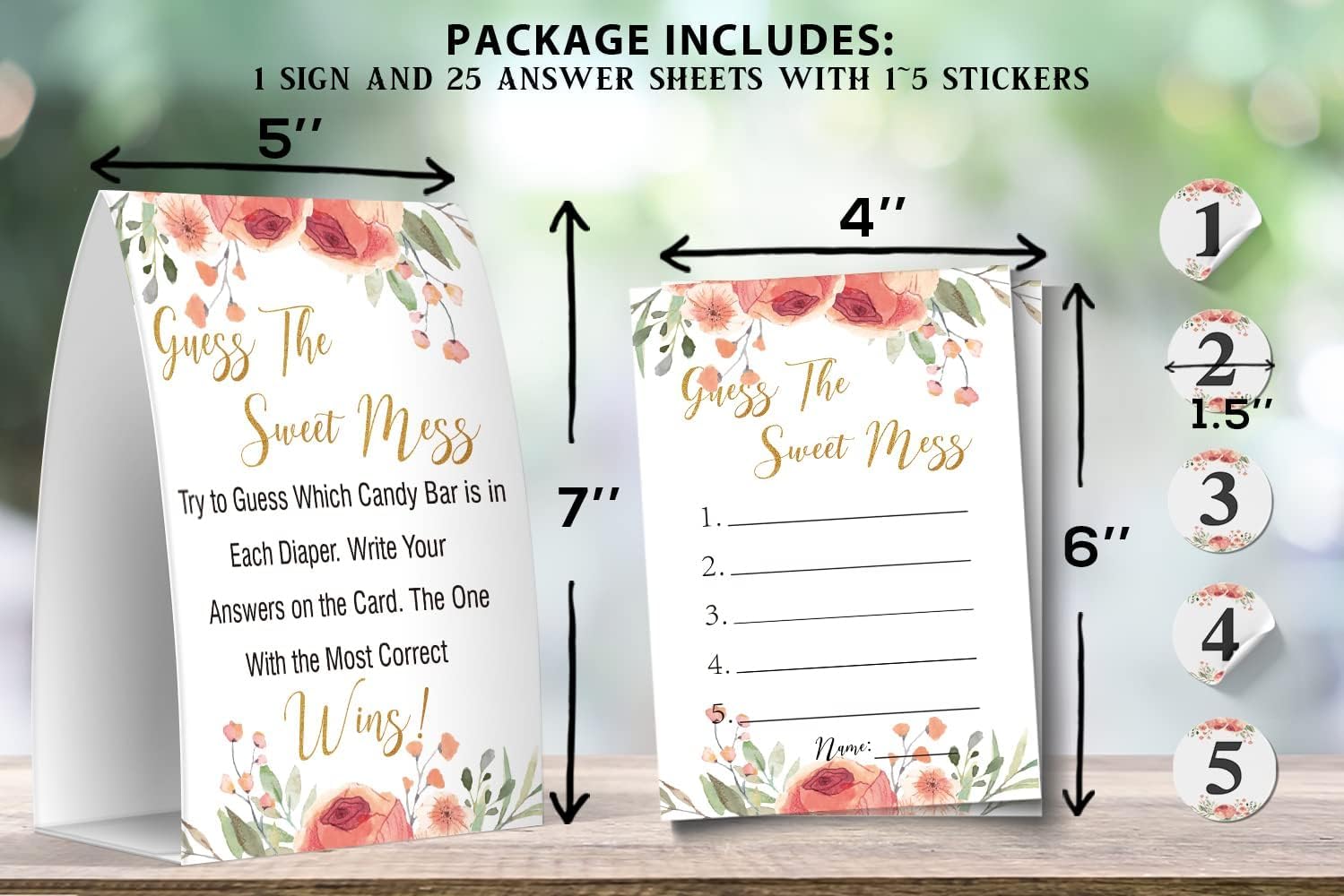 1 sign in 5x7in and 25 answer sheets in 4x6in with 1~5 stickers in 1.5in. High quality paper, high quality color printing, repeatable sticker.You need to prepare candies and diapers.Sticker for attaching to diapers, used for identifying the diapers to match with answer sheets.Guests will have fun with guessing which candy match the “poop” in the diaper to get more prizes.