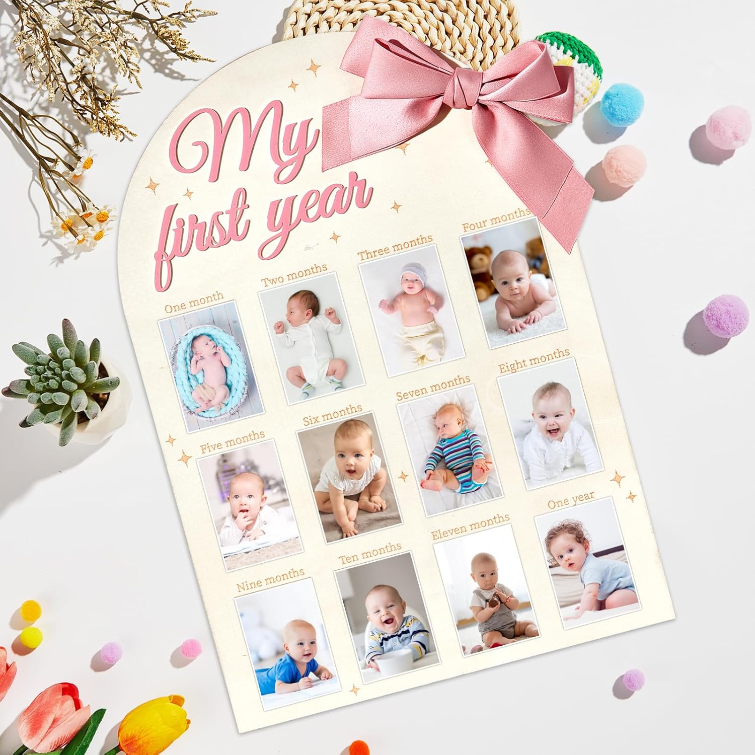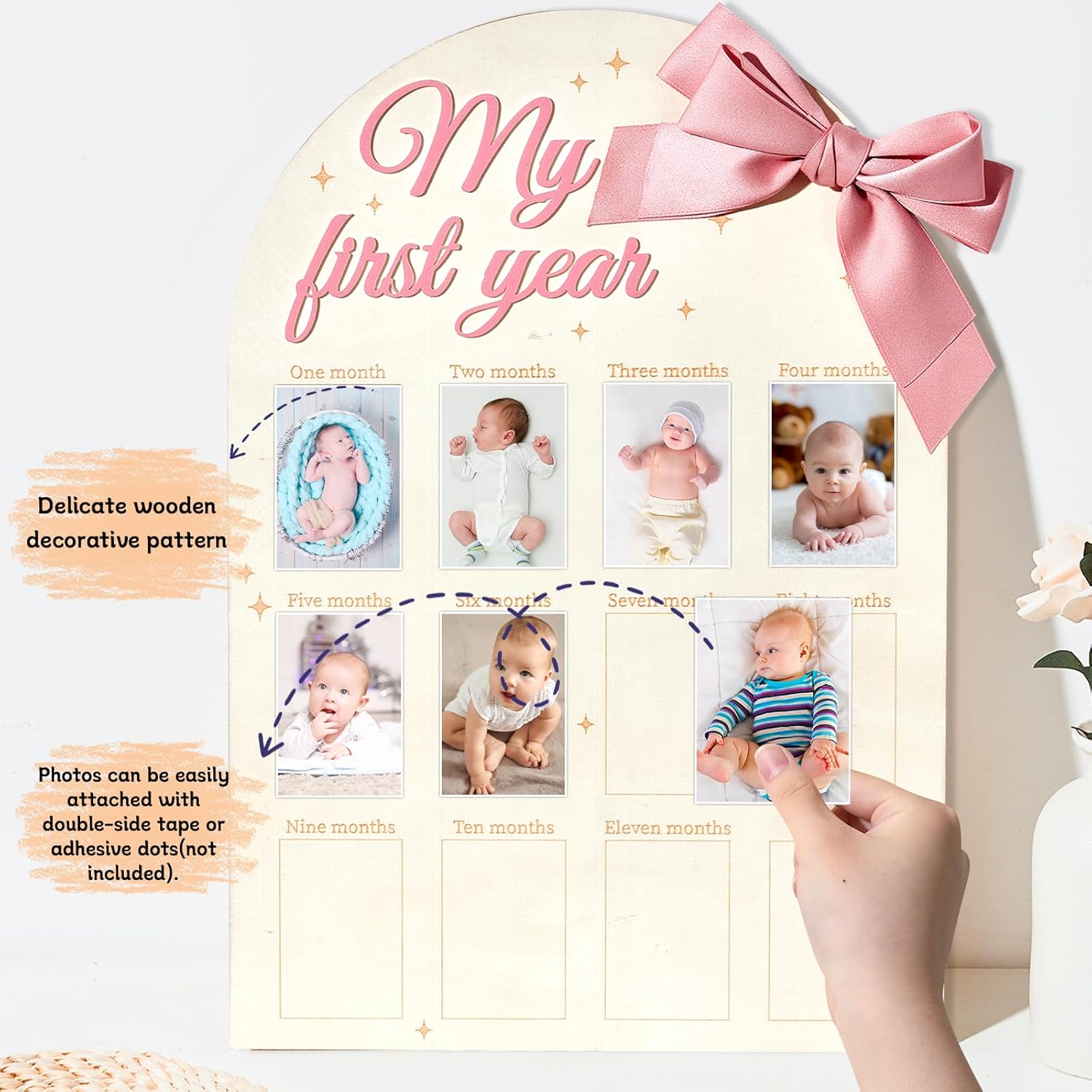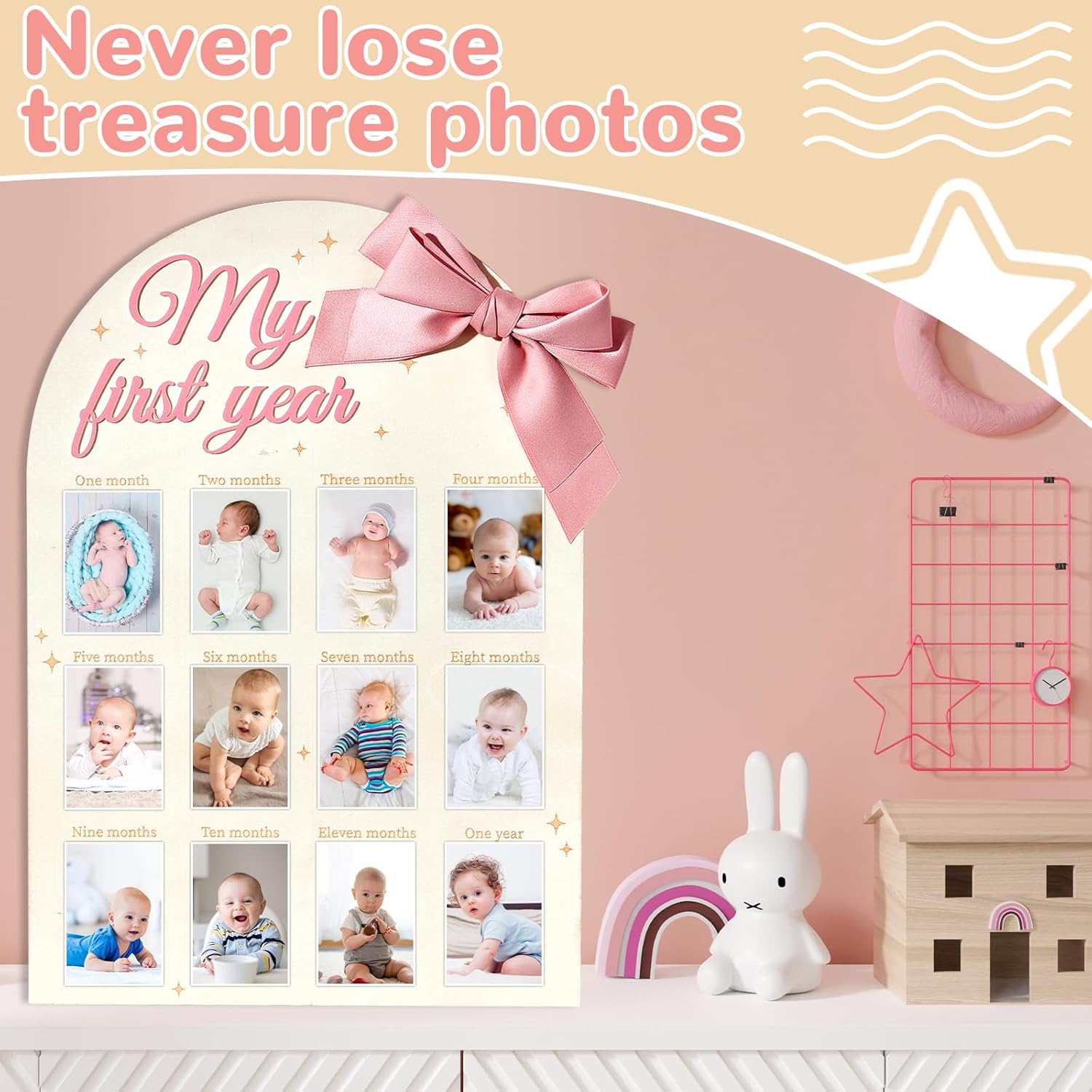 Package includes: This adorable my first year photo board set includes 1 pink wooden photo board (approximately 16.9×12 inches/43×30 cm) and a 3D bow accent (7.1×3.9×0.4 inches/18x10x1 cm), with 12 slots ideally sized (2×3 inches/5×7.5 cm) to hold your baby’s 12 month pictures for baby first year. It’s a heartfelt way to showcase monthly growth milestones. You can trim the bow ribbon yourself until it reaches the length you are satisfied with.