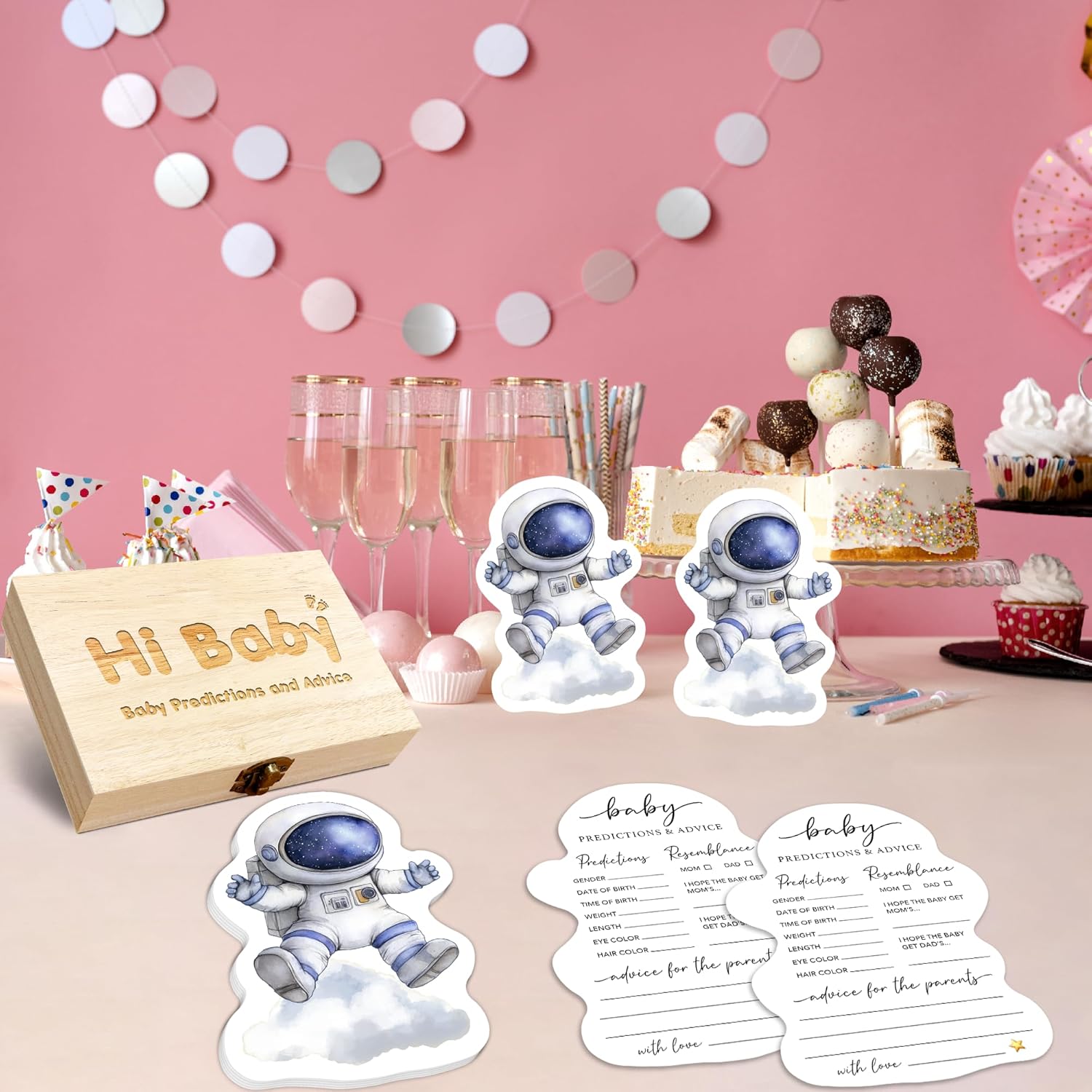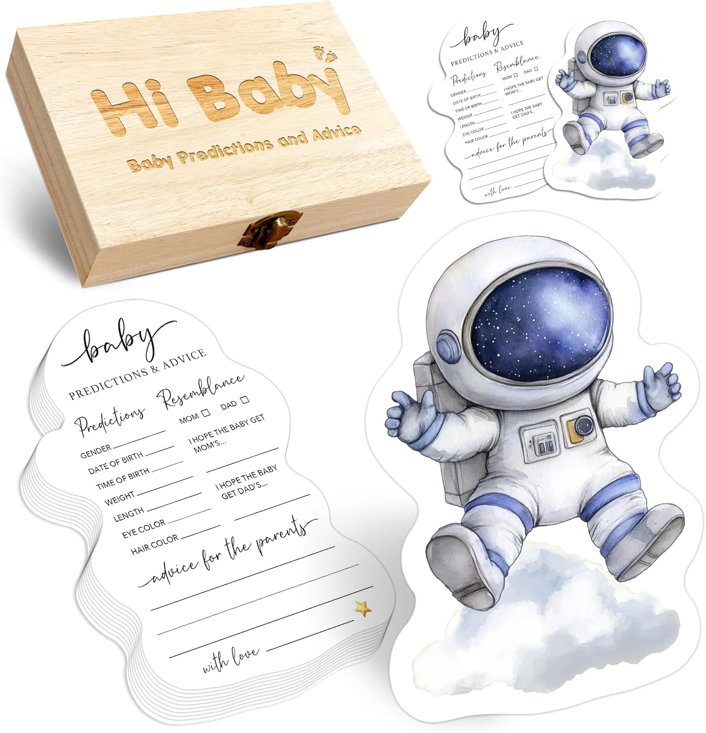 50 Pcs Space Astronaut Baby Prediction Cards with Wooden Keepsake Box – Baby Shower Game for Gender Reveal, Parenting Advice & New Parents Wishes – A01
