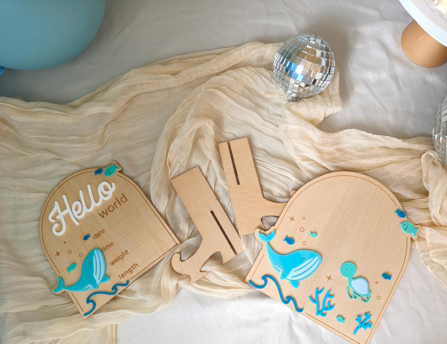 BOY UNDER THE SEA NEWBORN FOOTPRINT MILESTONE: This is one set plaque, come with a hello world board and a footprint board. They are all in good quality and condition.There come with a wooden standee, the white footprint part is in plain, you need to prepare white paint by yourself before singing your baby’s footprint on it.