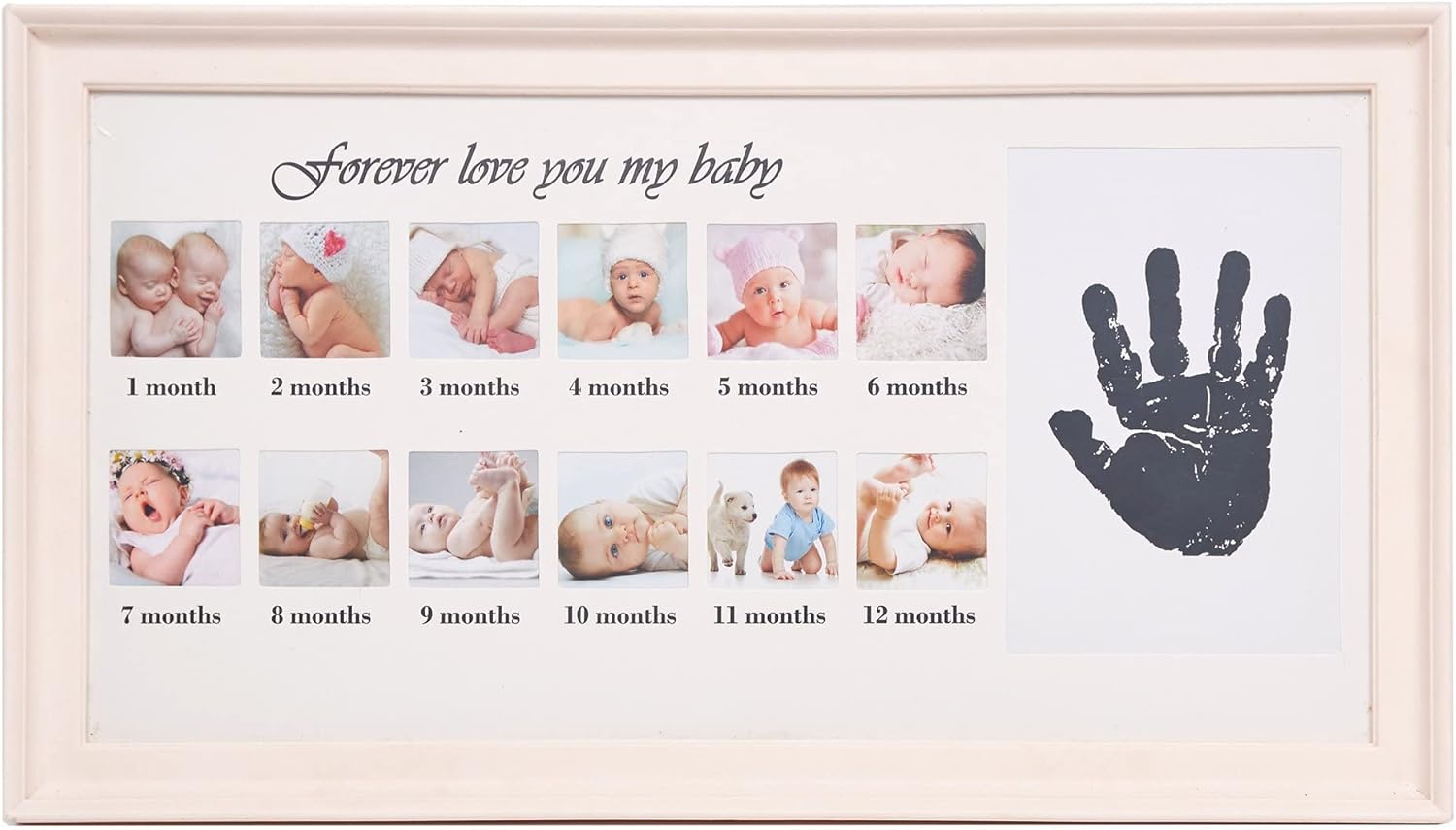 12 baby pictures to record baby’s monthly special moment during first year of life; 1 baby handprint or footprint to keep little baby’s lovely tiny hands or feet forever.