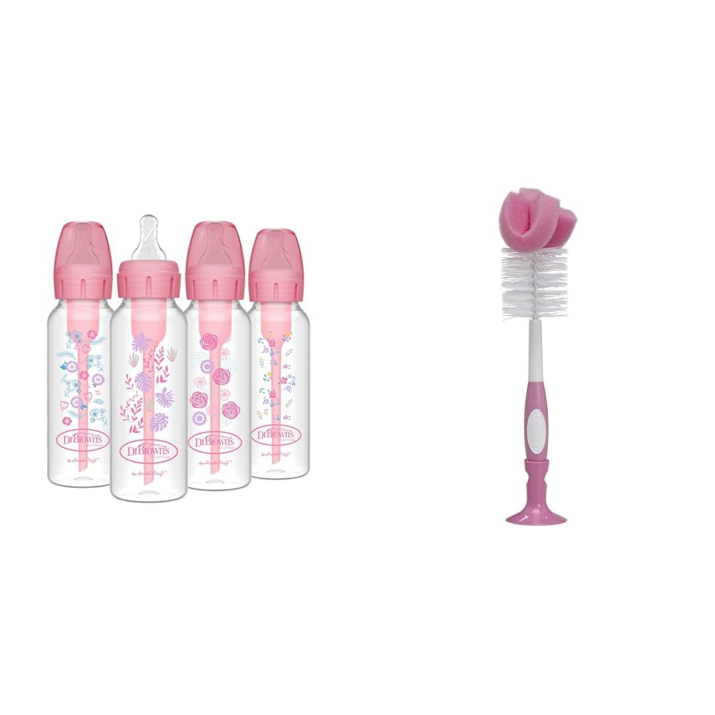 Dr. Brown’s Natural Flow Anti-Colic Options+ Narrow Baby Bottles, Floral Designs, 8oz/250mL, Pink, 0m+ & Reusable Sponge Baby Bottle Cleaning Brush with Suction Cup Stand, Pink 1-Pack