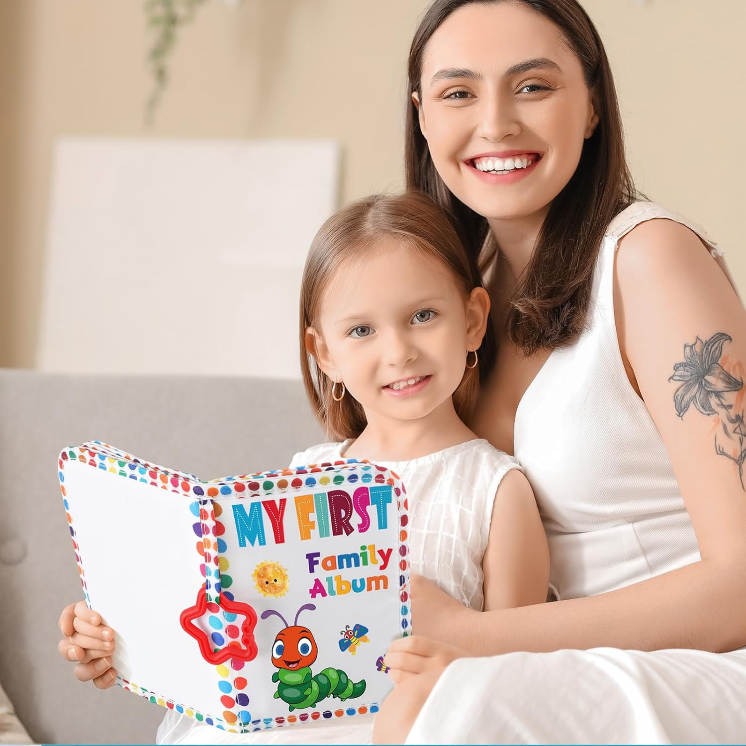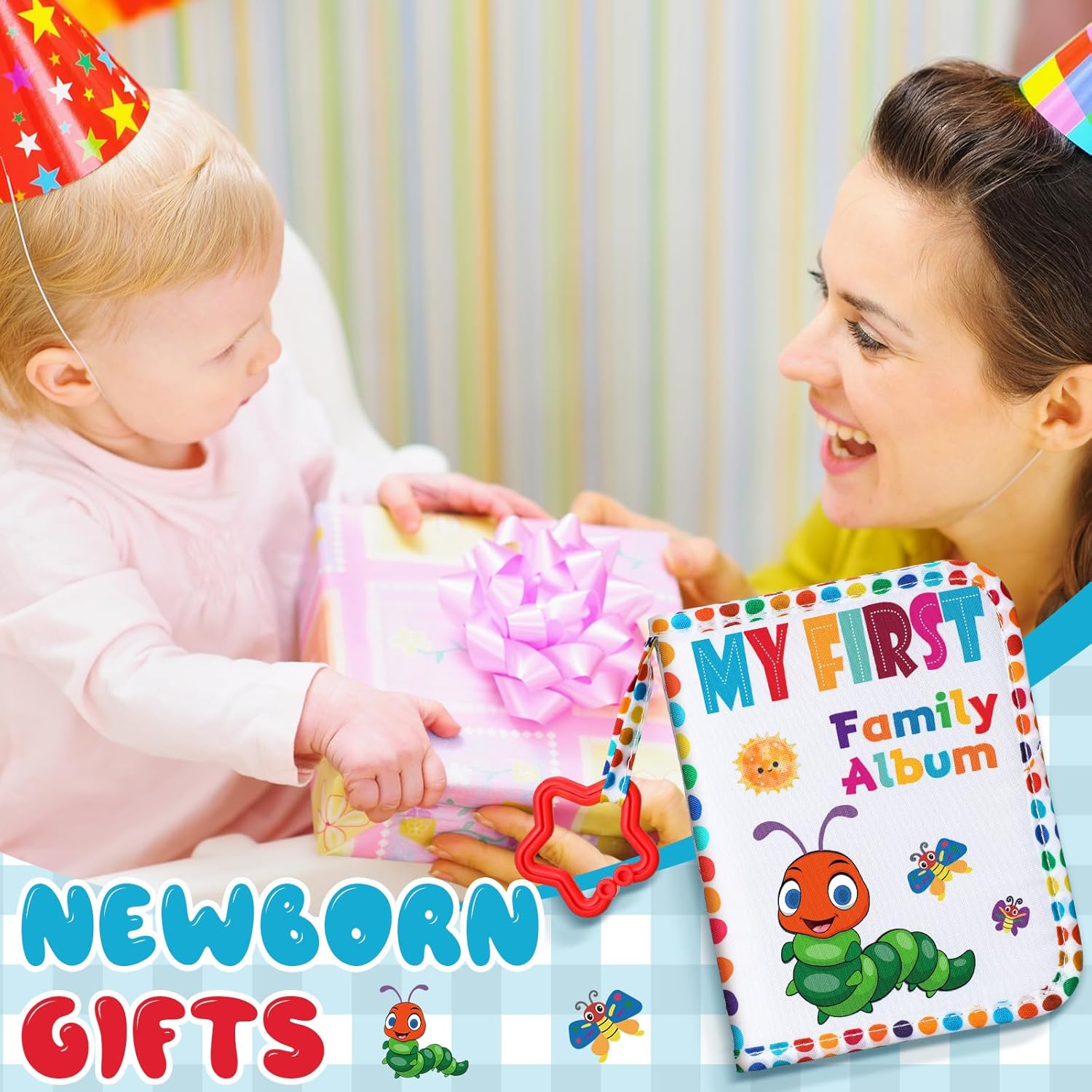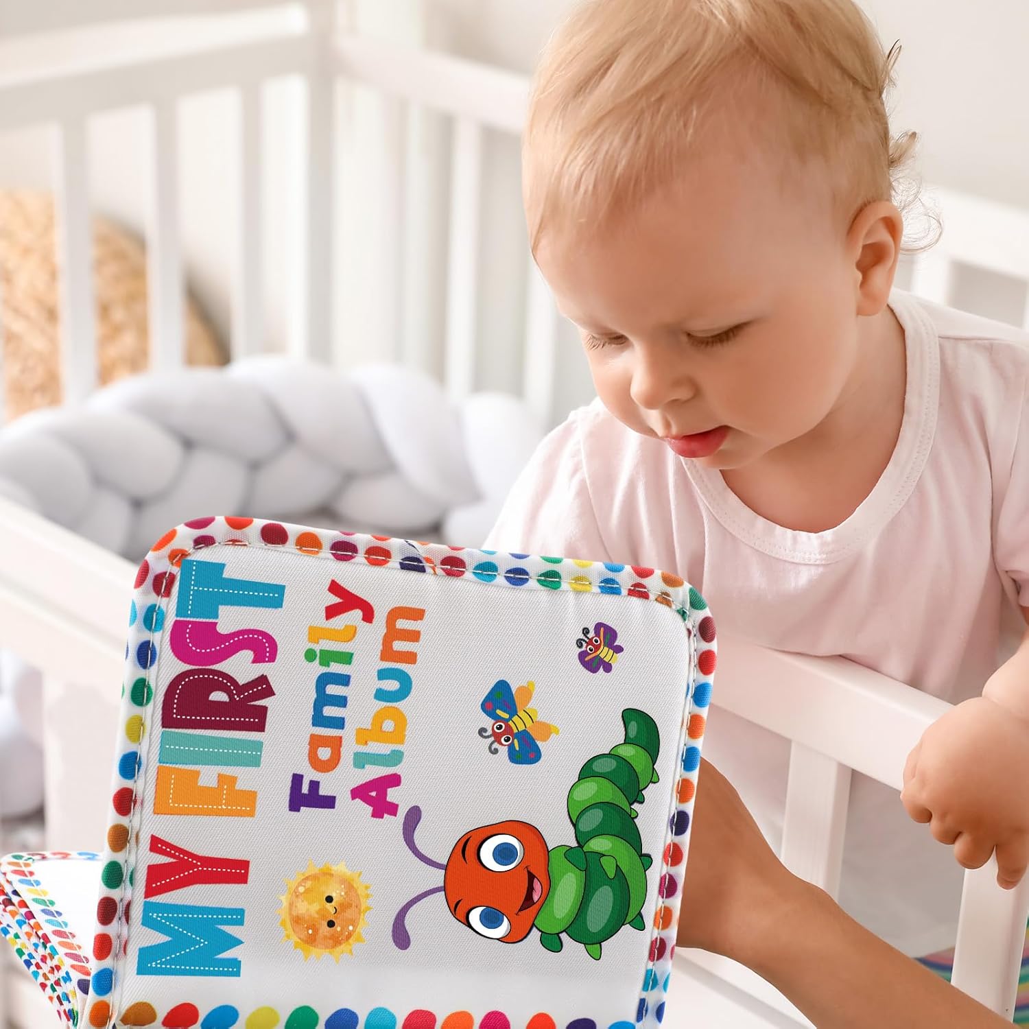 Size: with dimensions of 5.5 x 7 in, our family photo album can comfortably hold up to 4″ x 6″ photos; Plus, it comes with a handy teether ring that lets you attach it to any crib, stroller, or activity gym; You can even use it as a storybook for easy reading