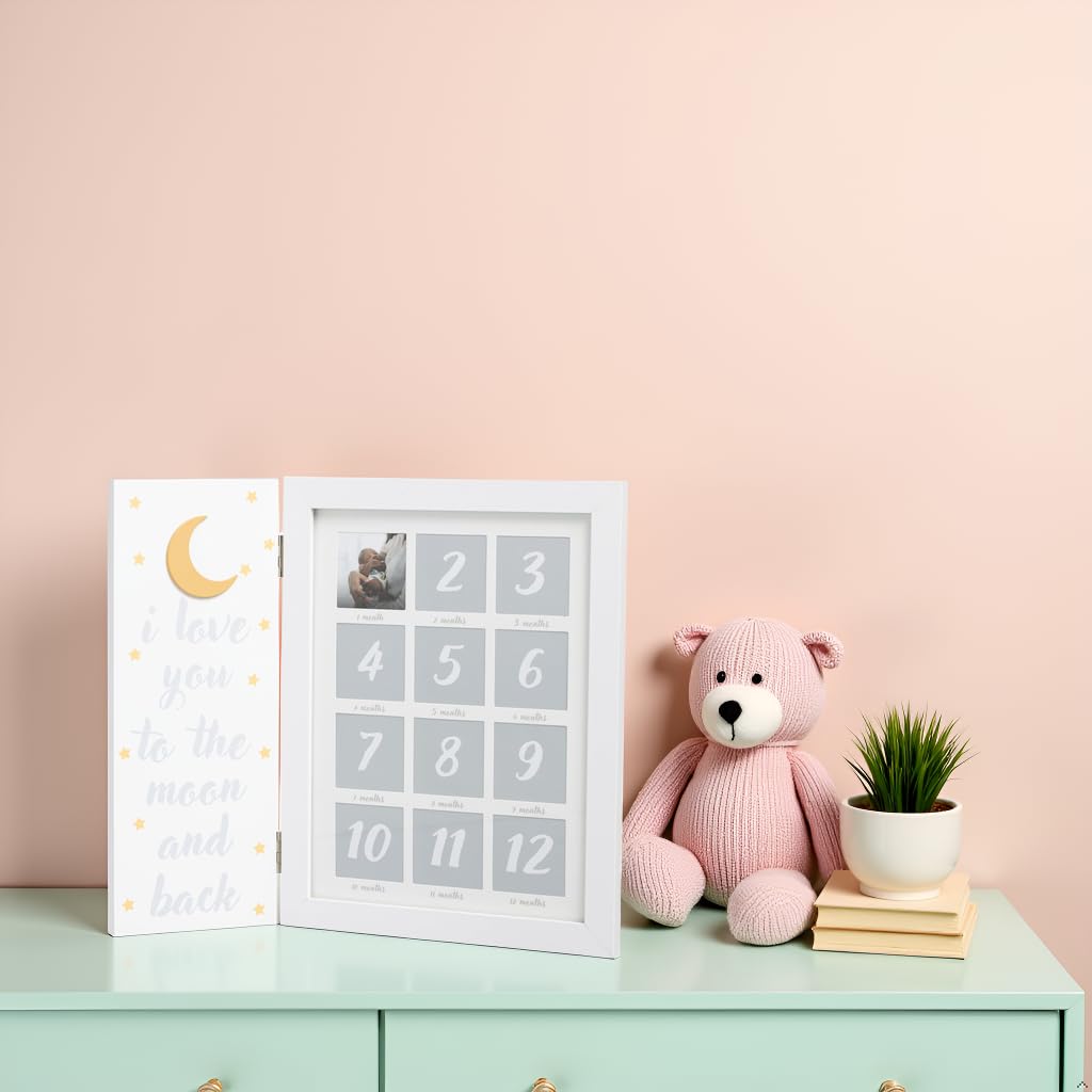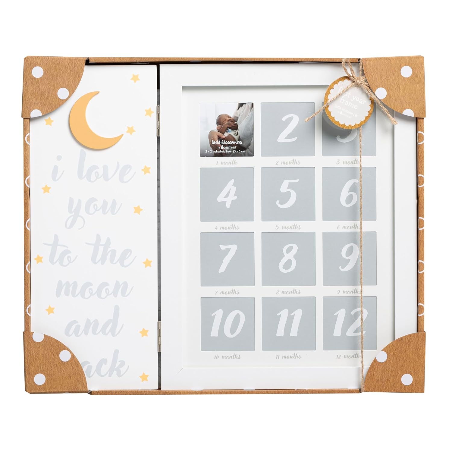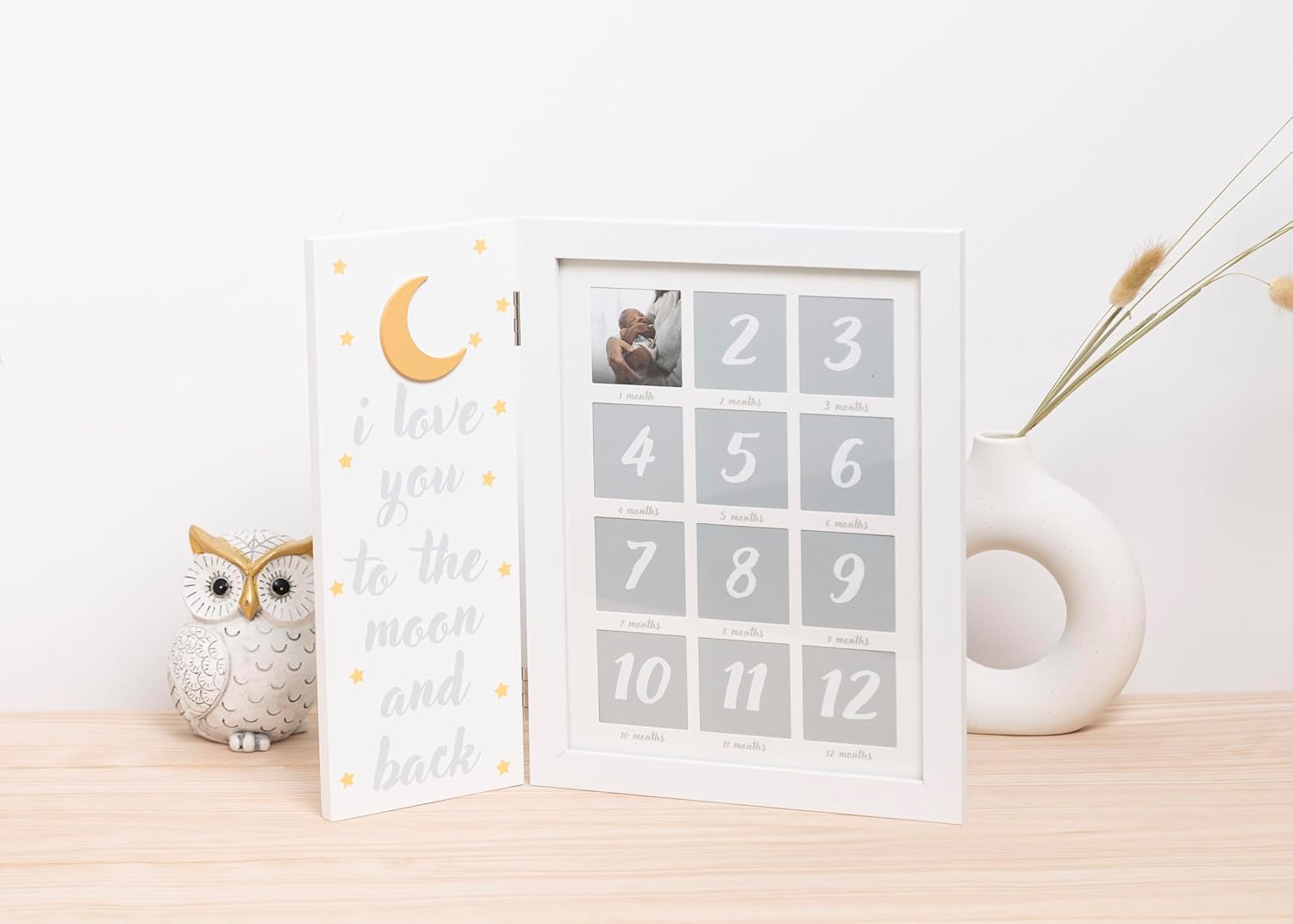My First Year Hinged Picture Frame, Baby’s First Twelve Months Photo Collage and Gender Neutral Keepsake, New Mom Gift and Nursery Décor, I Love You To The Moon And Back
