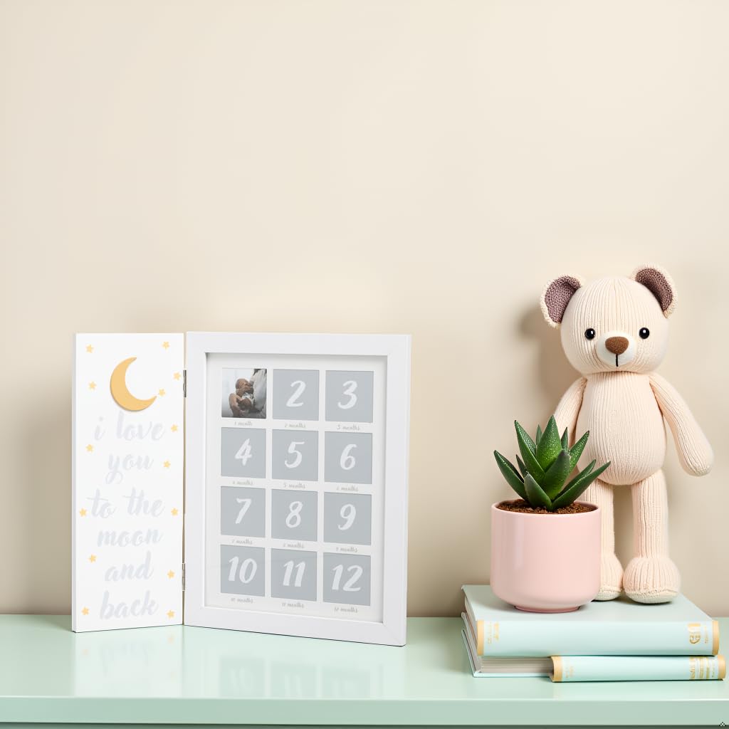 Celebrate your baby’s first year with Little Blossoms First Year Collage Baby Keepsake Frame. This beautifully crafted hinged tabletop frame features the heartfelt phrase, “I love you to the moon and back” alongside a moon and stars design. This collage photo frame holds your baby’s monthly milestone photos from “1 month” to “12 months” to easily see your baby’s growth from newborn to 1 year old. Perfect for baby girls and baby boys, this white and gray frame matches any nursery room décor or home décor. The tabletop picture frame stands securely on any desk, mantel, shelf, or nightstand. This baby photo frame makes a special gift for new and expecting parents, add it to your baby registry list for a baby shower gift you will cherish for years to come. Celebrate your baby’s precious milestones and decorate your newborn’s nursery with this unique and touching keepsake frame. Frame Size: 10.625” H x 12.625” W Photo Inserts: 2” x 2”