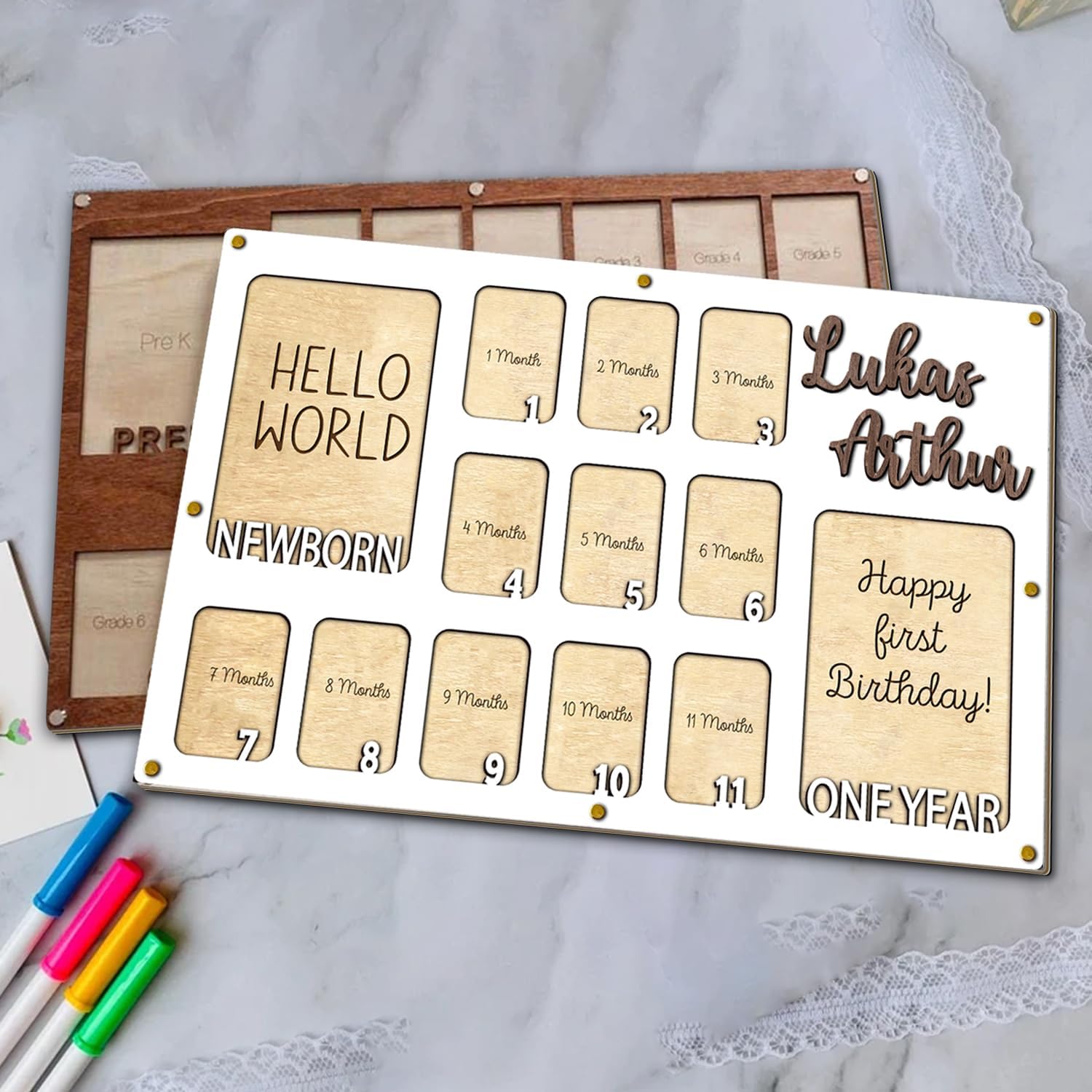 Capture your baby’s first year with our babys first year photo frame. This baby first year photo frame helps you record their growth from newborn to one year, showcasing each milestone in a 12 month picture frame for baby first year. The wooden plaque includes space for your baby’s full name, making it a personalized keepsake. Our my first year photo board, one year photo board is a wonderful way to celebrate these moments, and the nursery picture frames add a special touch to any room.