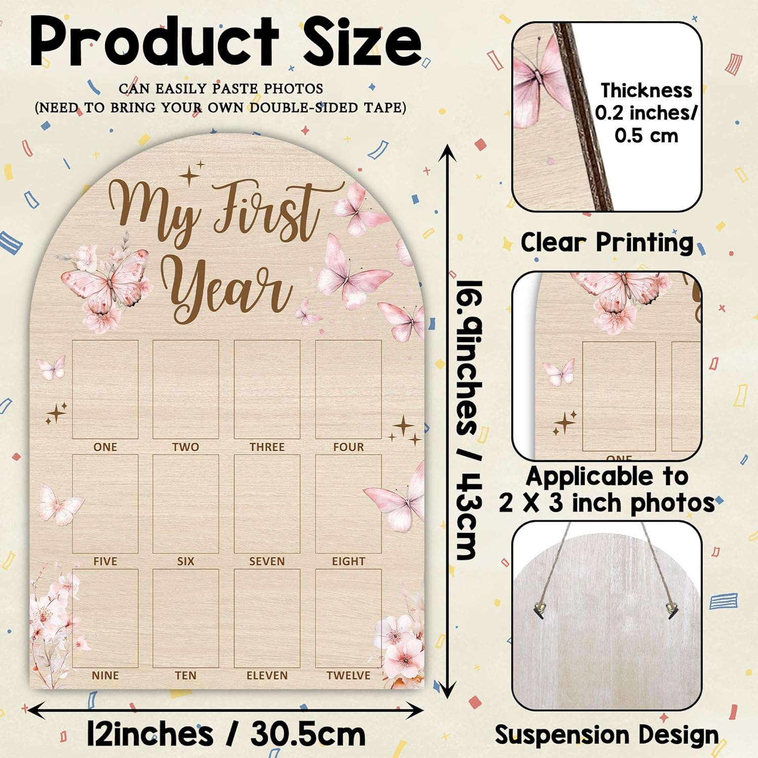Size Design: My first year milestone board size 16.9×12 inch, photo areas sized for 2×3 inch pictures, celebrate the first anniversary of your baby’s birth with this charming baby picture frame