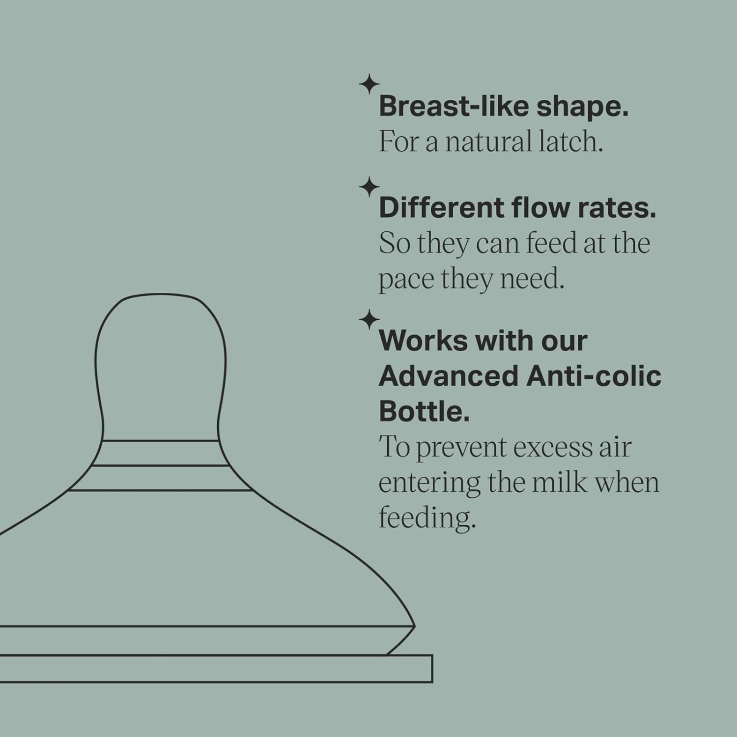 Choice of Flow: Flow rate is as important as nipple shape when it comes to bottle acceptance. Advanced Anti-Colic bottle nipples come in different flow rates to keep up with your growing baby