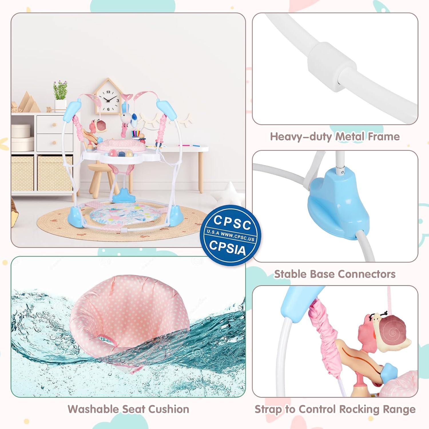【Safe, Sturdy & Easy to Clean】 Made with a durable metal frame and built-in springs, this baby play center ensures safe bouncing. The seat pad, toys, and foot mat are removable and washable, making cleanup quick and easy. Max weight capacity: 26.5 lbs. A reliable baby bouncer activity center.