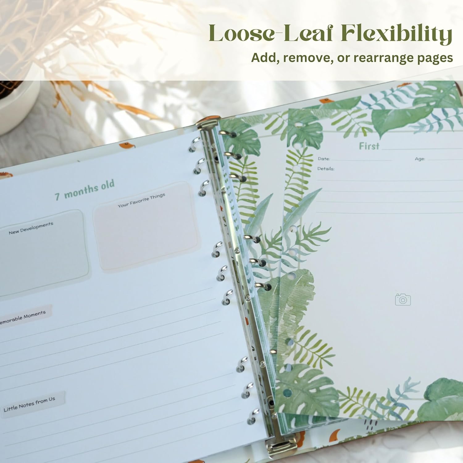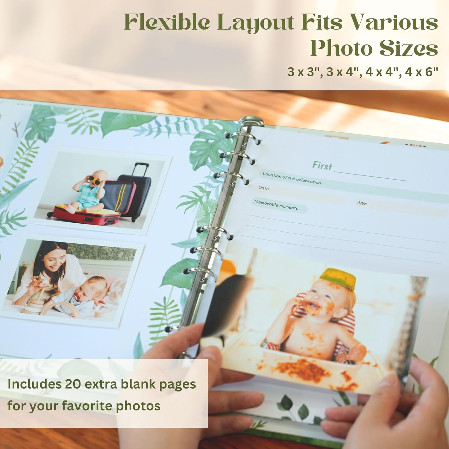 Flexible, Customizable & Photo-Friendly Design: This loose-leaf baby photo album includes 20 extra blank pages for photos. Its open-ring format lets parents add or remove pages with ease. Each photo space is thoughtfully designed to fit standard print sizes (3×3″, 4×4″, or 4×6″), making it simple to preserve your favorite memories without trimming or resizing.