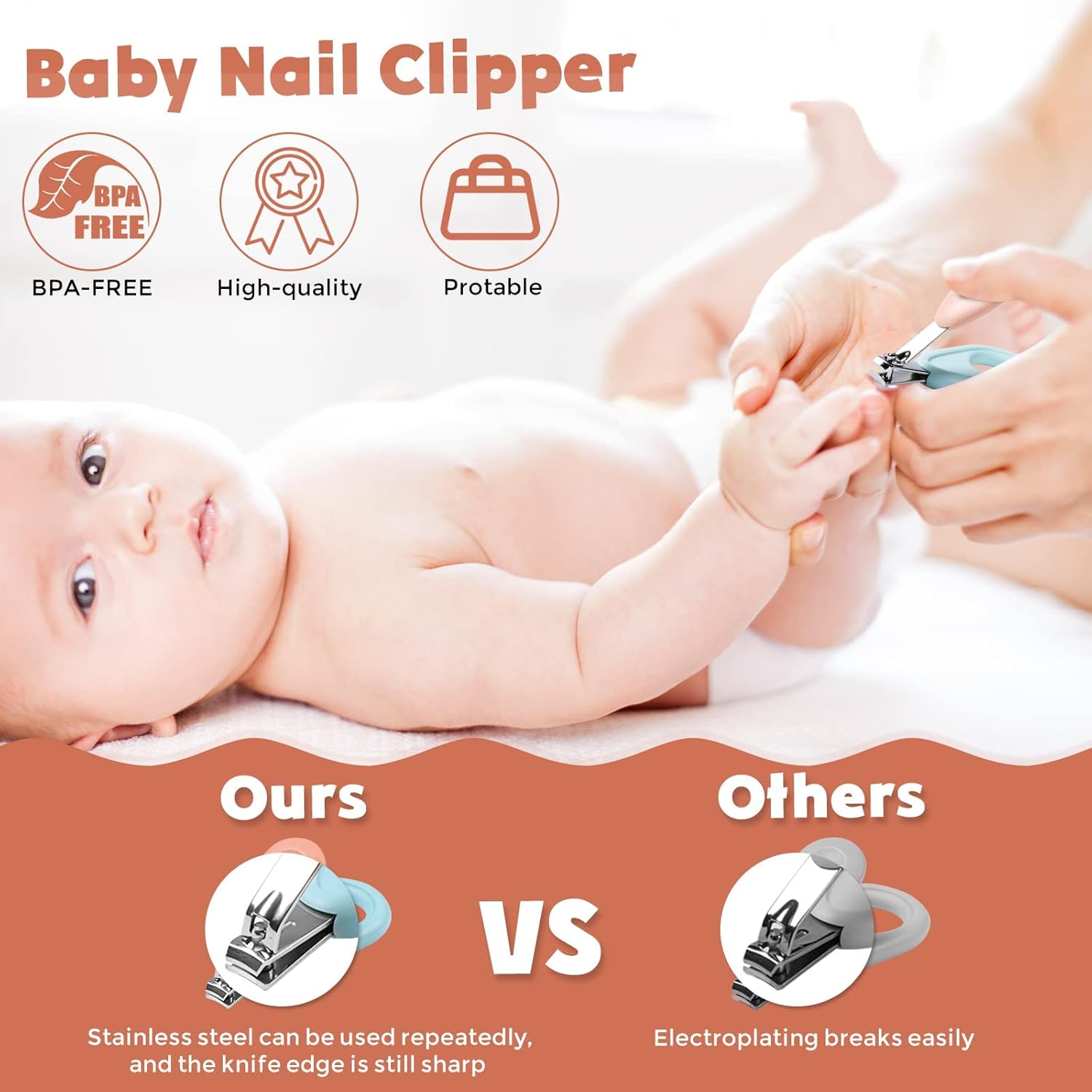 Metal parts are made of stainless steel, making the baby nail clipper and scissors non-blunt and rust-freeHandles are crafted from ABS, a plastic material known for good strength and toughness