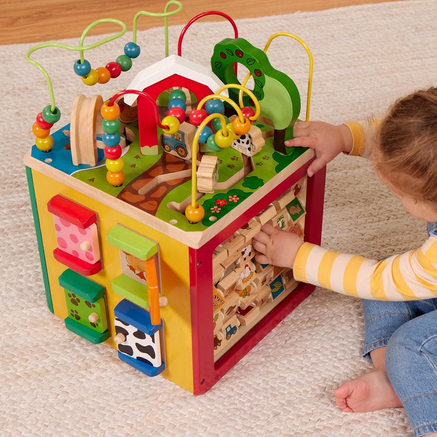 TIME FOR FUN: This wooden cube toy has so much to discover. Drive the tractor around the farm, move the colorful beads through the bead maze, spin the spinners, or mix and match the animal puzzles. This learning toy cube offers hours of fun.