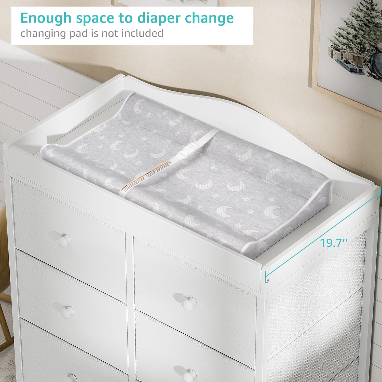 6 Fabric Drawers Storage: Features 6 drawers for baby essentials, such as babies’ clothes, baby cream, towels, and socks. Changing pad not included