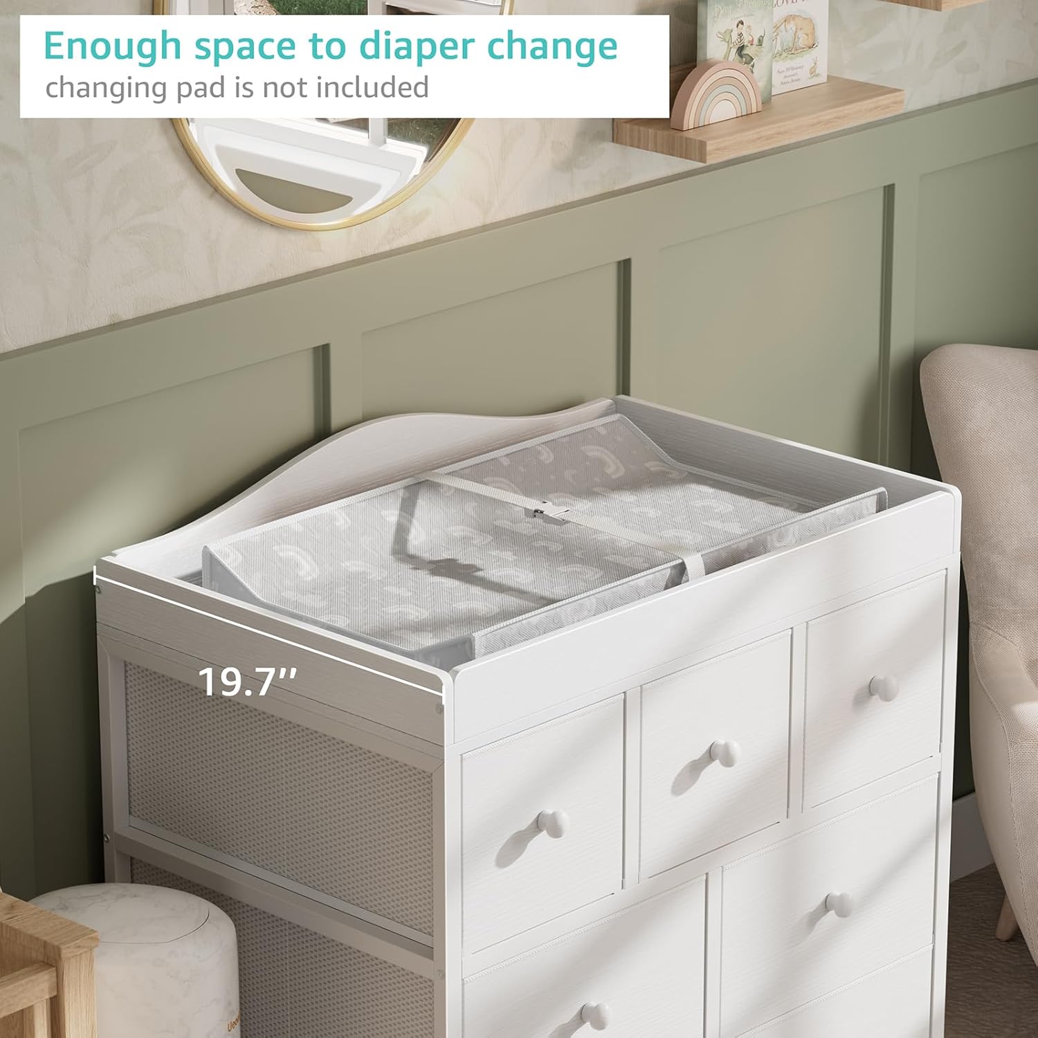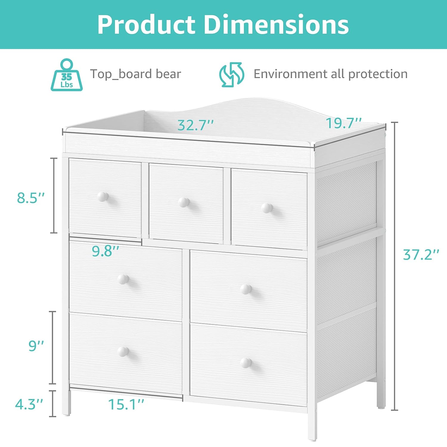 Multiple Sizes Fabric Drawers Storage: Features 7 drawers for baby essentials, such as babies’ clothes, baby cream, towels, and socks. Changing pad not included