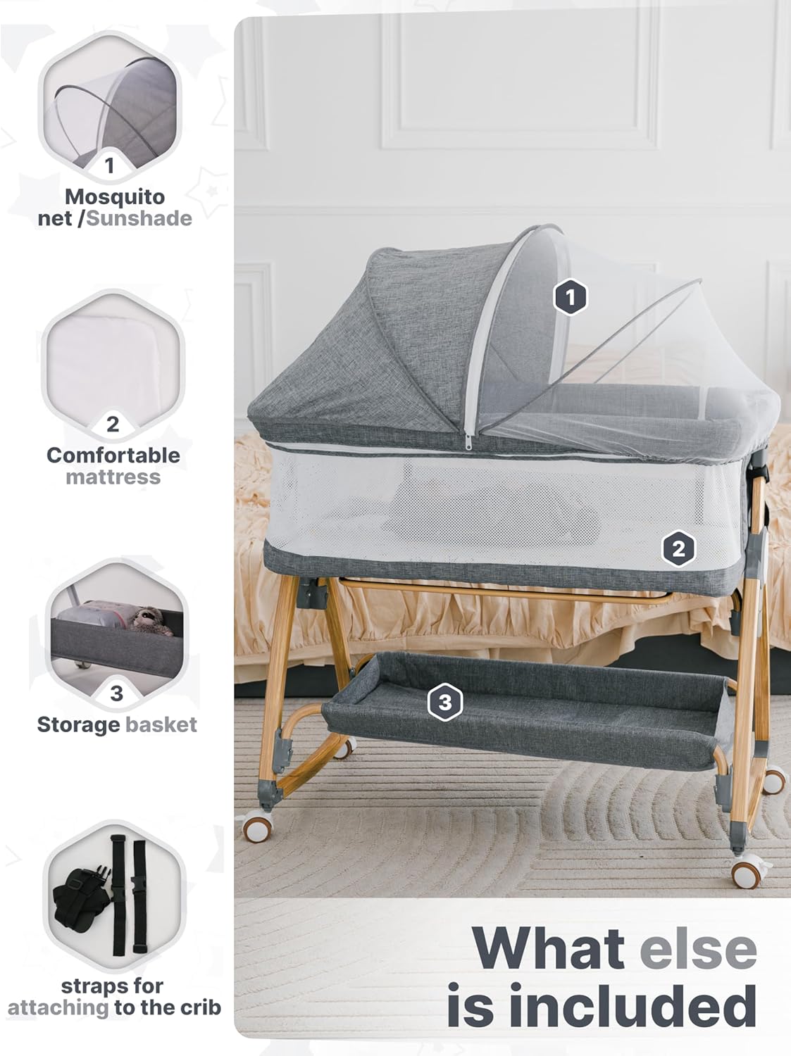 Adjustable Height & Secure Fit – 6 height levels to match your bed. Safety straps firmly attach the bassinet to your bed frame, preventing gaps and keeping your baby secure.