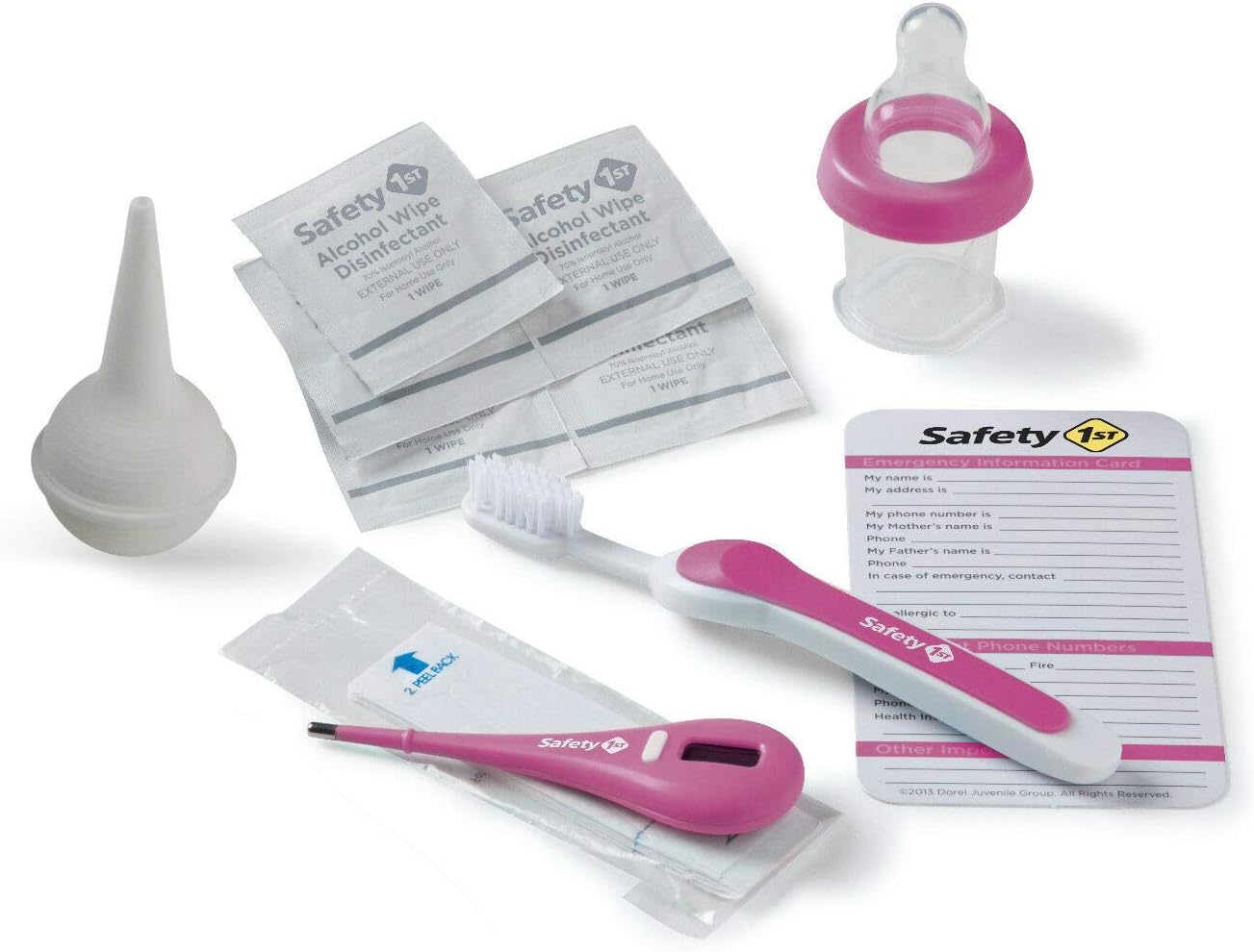 The Nursery Care Health & Grooming Kit by Safety 1st gives parents a convenient all-in-one kit containing a full assortment of baby essentials that are great to have along when on the go. This deluxe assortment includes a 3-in-1 thermometer with probe covers (5), nail clippers with emery boards (5), nasal aspirator, brush and comb, a toddler toothbrush with an easy-to-hold handle, a bottle medicine dispenser that lets you give baby medicine in a comforting way, alcohol wipes (5) and emergency info card. The wrapping clutch case with zippered, clear-view compartments helps you to easily keep things where you can see them and get to them quickly. Toss the case into your diaper bag and it’ll be there when you need it. Safety 1st believes parenting should have fewer worries and more joyful moments. As the first and only leader in child safety, Safety 1st is here to give you peace of mind so you can spend less time worrying and more time enjoying every first you experience with your child.