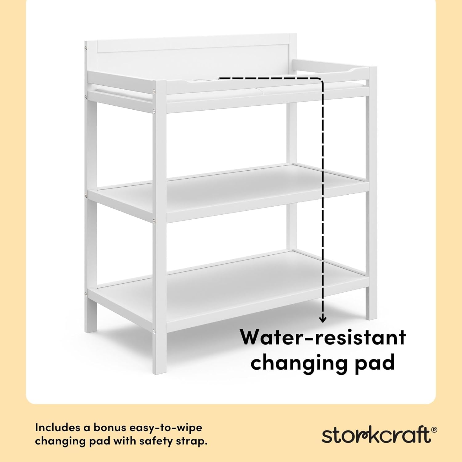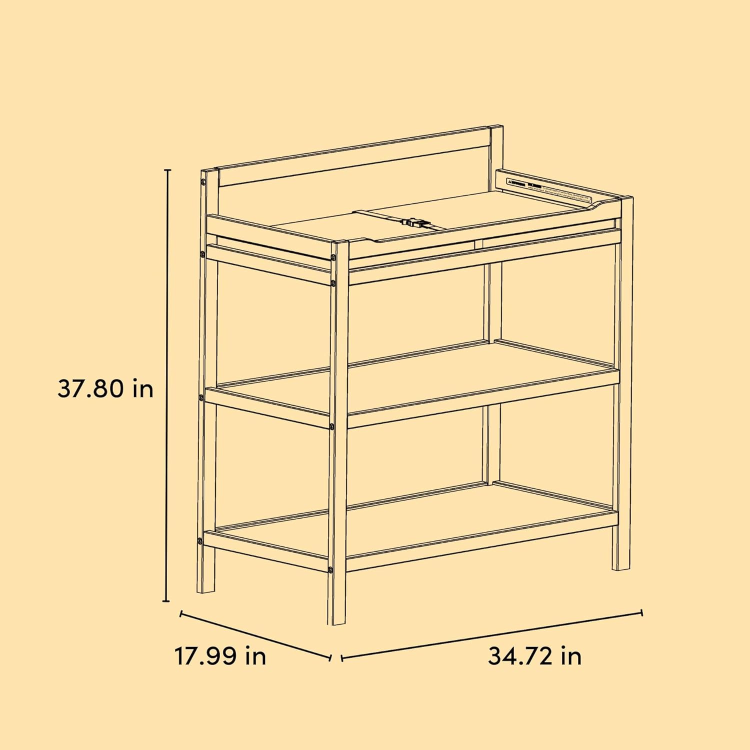 The Storkcraft Alpine Changing Table combines clean lines, modern style, and a universal design that will match perfectly with your baby’s nursery. The Alpine includes a water-resistant vinyl changing pad with safety strap, and 2 open shelves to keep your most important nursery essentials nearby. JPMA certified and tested to meet or exceed all applicable federal safety standards, the Alpine is backed by Storkcraft’s 1-year limited warranty and supportive customer care. Complete the Storkcraft Alpine Collection with the matching Alpine 4-Drawer Chest, Alpine 6-Drawer Double Dresser, and Alpine 4-in-1 Convertible Crib. Exclusively from Storkcraft, proud recipient of the 2022 Women’s Choice Award for 9 out of 10 Customer Recommended Baby & kids furniture.