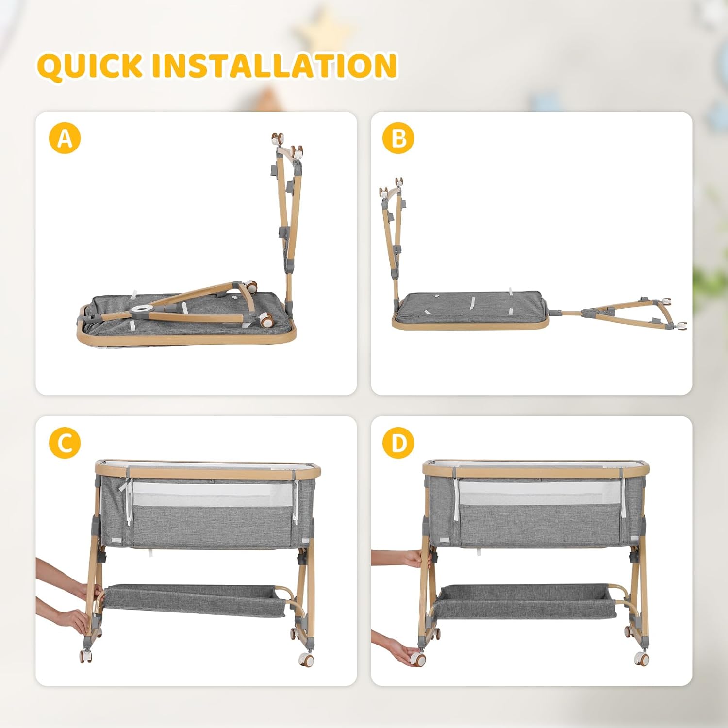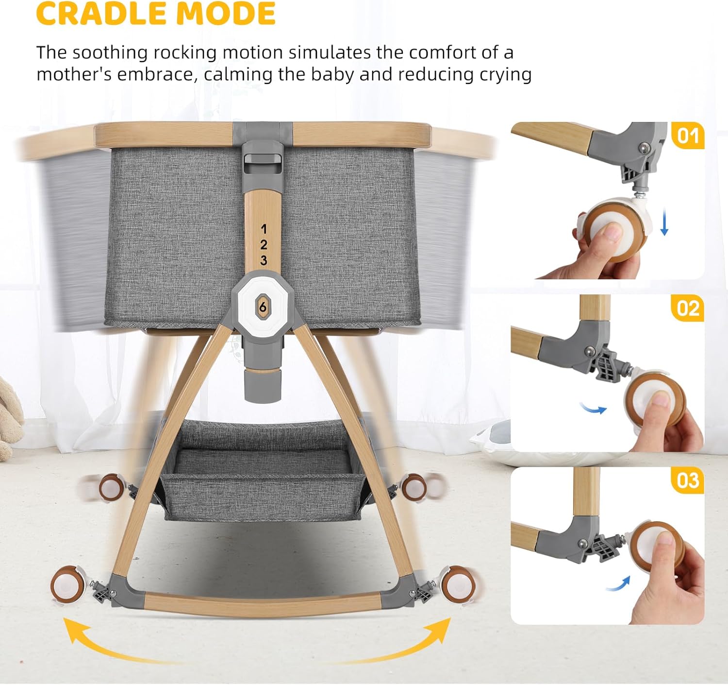 EASY TO MOVE: The baby bedside sleeper is equipped with four wheels on the bottom, allowing the bassinet with wheels to be moved freely around the home. The casters are fitted with an automatic locking device that locks all the wheels to rest securely without accidental sliding. The four wheels flip upwards, instantly converting into a bassinet, and the slight rocking from side to side helps baby fall asleep faster.