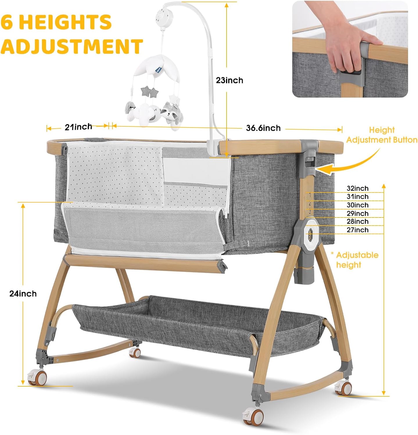 Bassinet Bedside Sleeper,3 in 1 Bedside Bassinet for Baby,Rocking Bassinet for Baby with Mattress,Mobile,Mosquito Net,Storage Basket,6-Height Adjustable Bassinet with Wheels for Newborn Infants