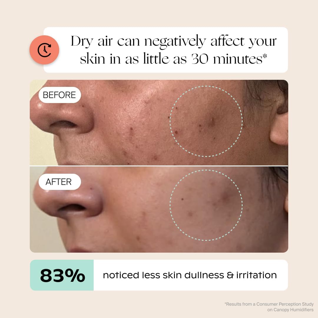 THE HEALTH BENEFITS OF HUMIDITY: The Canopy Humidifier helps optimize your living space to have the ideal level of humidity. Ensuring proper humidity helps to hydrate skin; combating dryness, dullness and fine lines & wrinkles. Increased skin barrier function to protect from pollution. Alleviate cough, nasal congestion and other symptoms of cold, flu and allergies. Provide clean and safe aroma diffusion for a calming environment