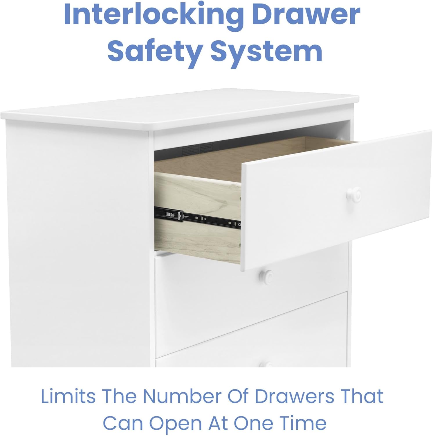 INTERLOCKING DRAWERS: Interlocking drawer system limits the number of drawers that can be opened at one time | Tested to meet the current requirements of ASTM F2057, the mandatory CPSC safety standard that protects children from tip-over incidents