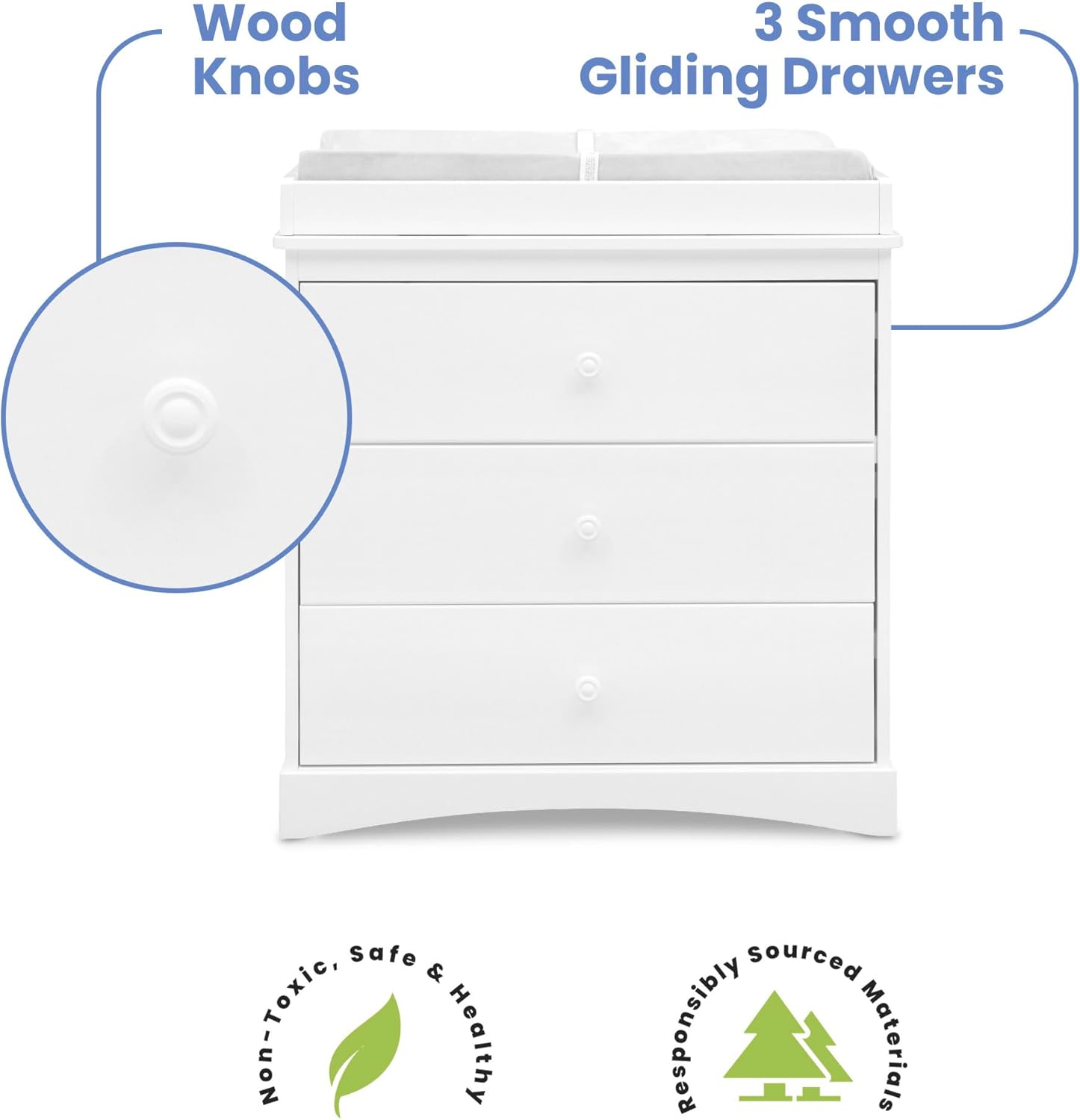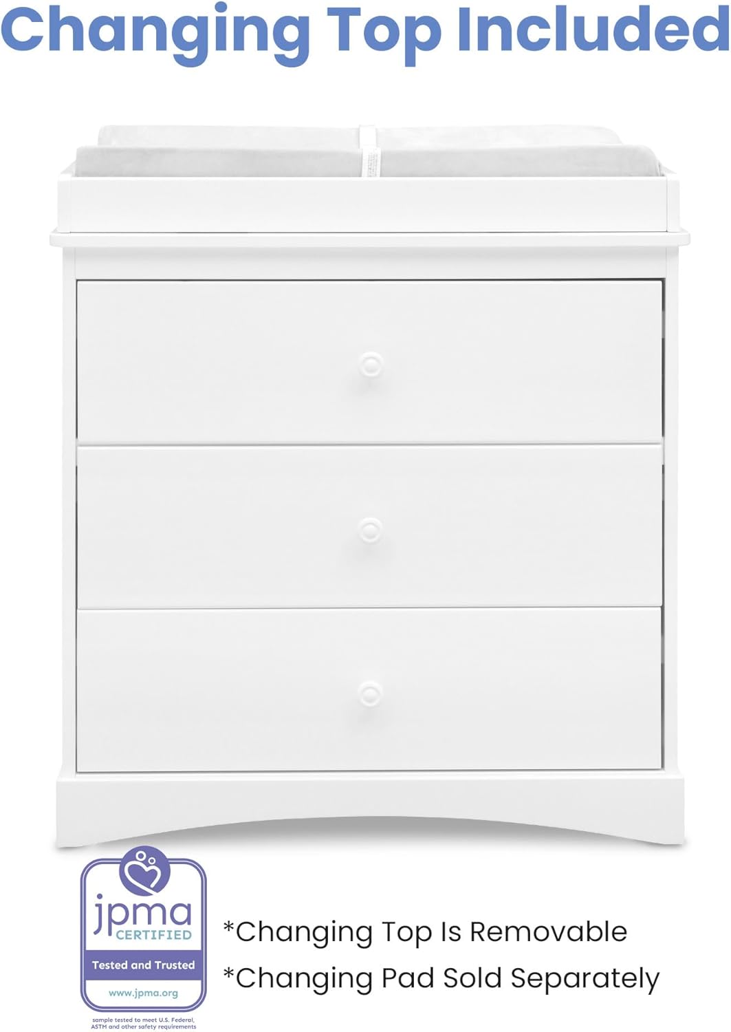 VERSATILE STORAGE: This dresser features 3 drawers for plenty of storage space | Removable changing top included (changing pad sold separately, recommended size: 32″W x 16″D x 1″H)