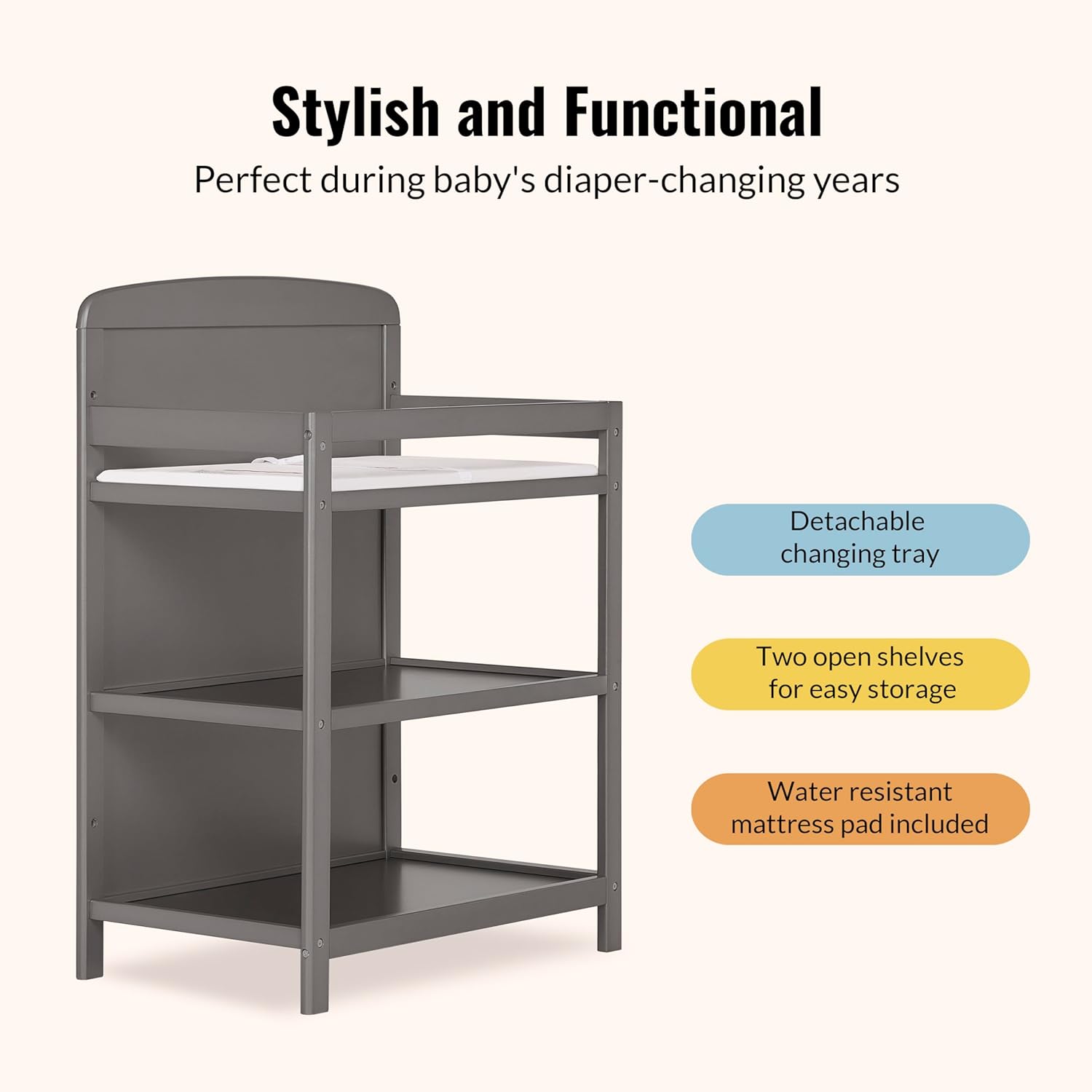 USEFUL CHANGING TABLE: The Anna is fitted with a changing table with a custom fit 1” changing pad. There are two open storage shelves beneath the table, with ample space to store baby essentials