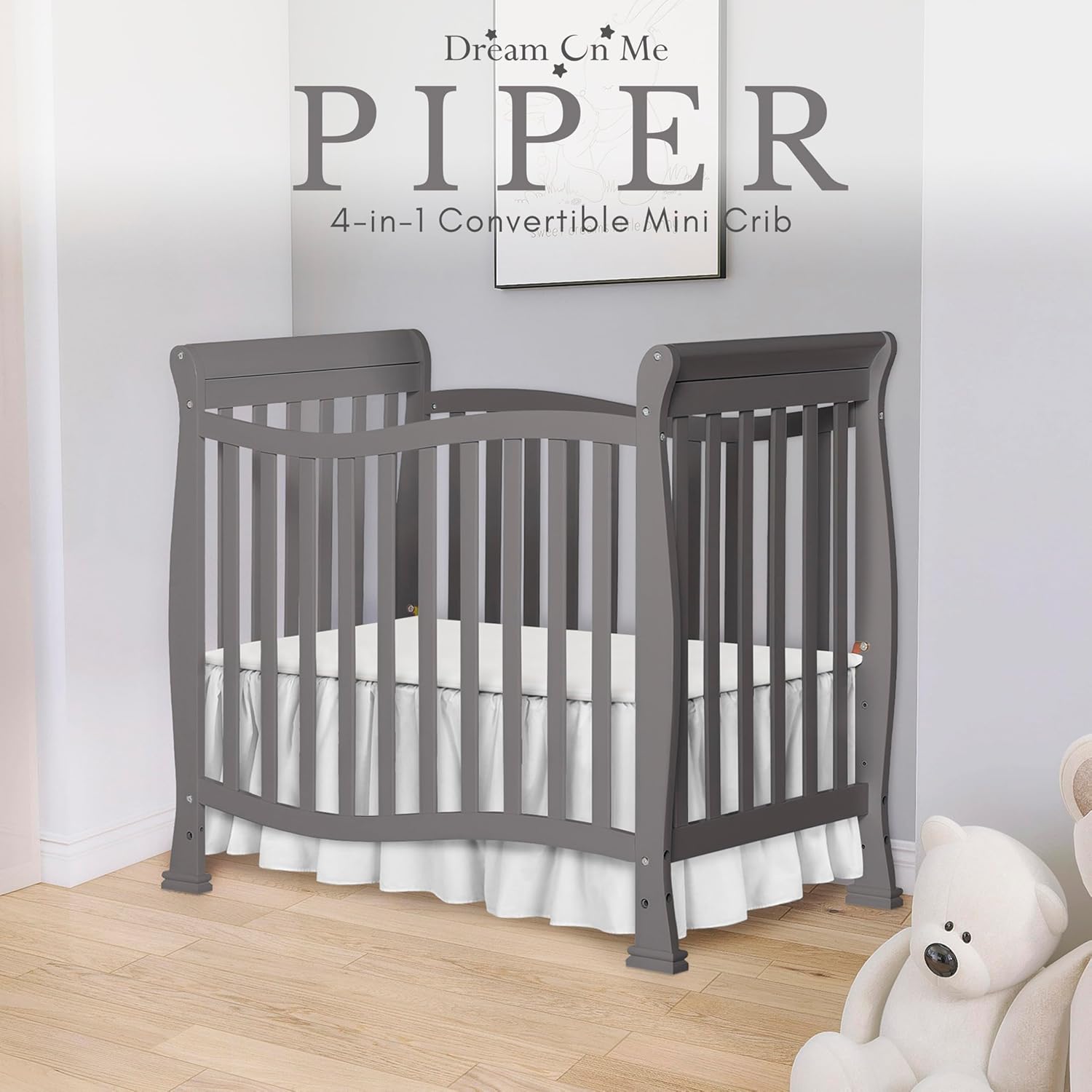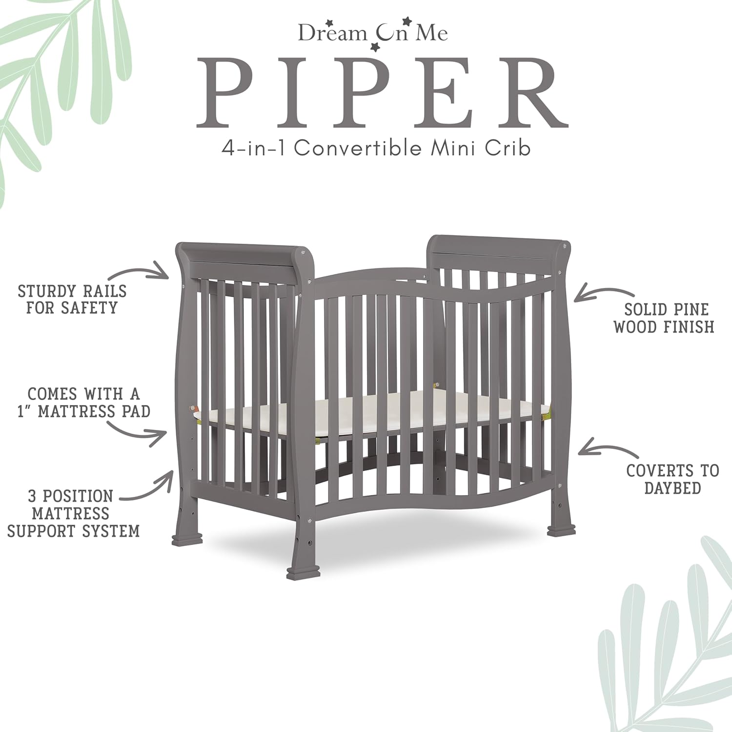 The Violet 4-in-1 Convertible Mini Crib is the perfect nursery solution for small spaces and to keep pace with the changing needs of your growing child. Starting as a mini crib, you can convert it into a mini daybed and twin-size bed (bed rails sold separately).Built of solid pinewood, the Violet attracts with a flowing and curvy design. Minimalist with a small footprint, it is ideal to make the most of small spaces or when you are co-sharing with your baby. You can choose from pleasant non-toxic, water based paint finishes and create a stylish space for your child.The Violet has a 3-position adjustable mattress height setting that you can adjust as your child grows. It comes with the regulatory 1” mattress pad. Choose a Dream On Me non-toxic, Greenguard Gold certified mini or portable crib mattress for a perfect fit. At Dream On Me we prioritize safety. All our cribs are JPMA certified and are tested for lead and other toxic elements to meet/exceed government and ASTM safety standards. Product dimensions are 40L x 25W x 36H inches. Maximum weight limit is 50 lbs. All tools/assembly instructions included.
