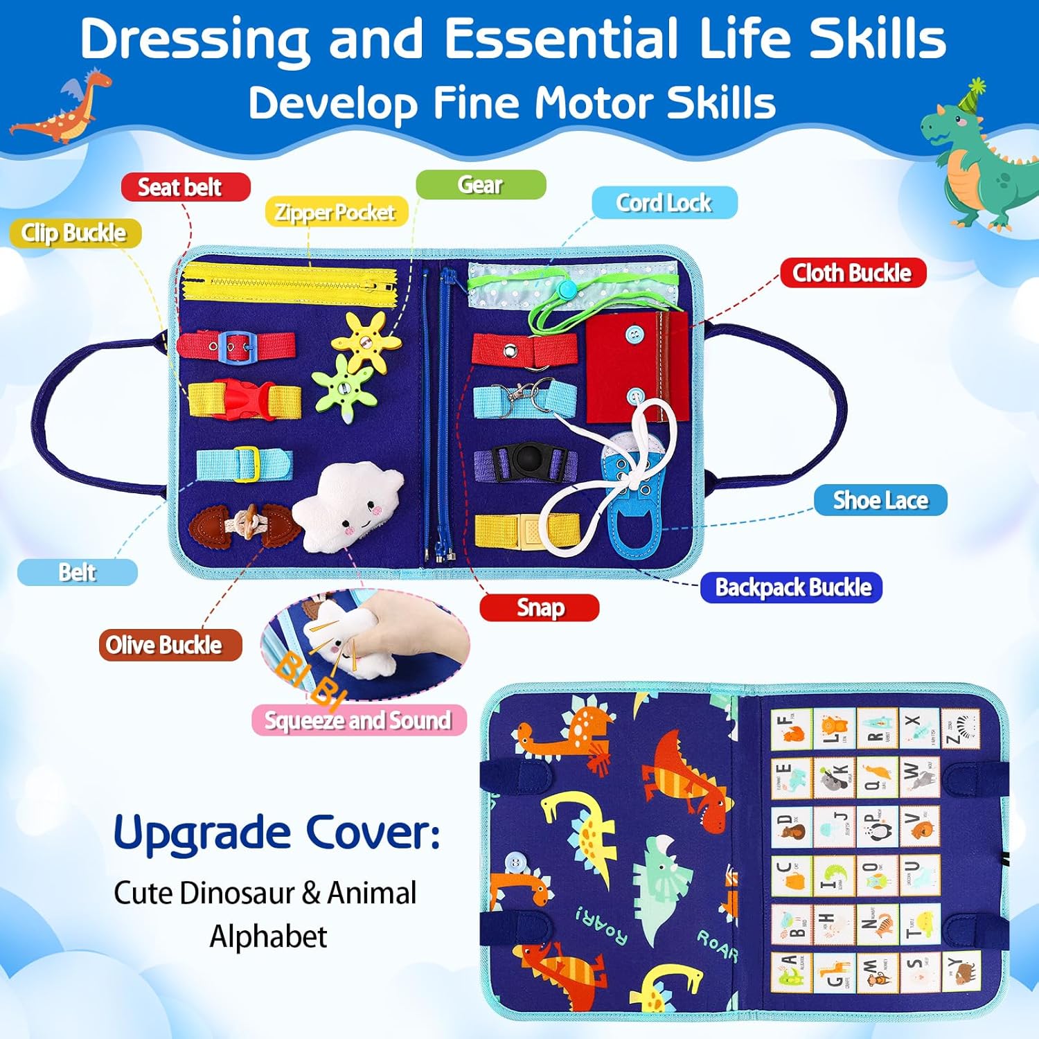 [DECENT GIFT]: Esjay Montessori busy board for toddlers gifts is made with quality and care, sturdy enough to hold up to toddler’ s use. The covers are printed with cute dinosaur pattern and animal alphabet, makes it a decent Christmas and birthday gift for boys and girls. WARNING: CHOKING HAZARD — Small parts. Not for children under 3 yrs.