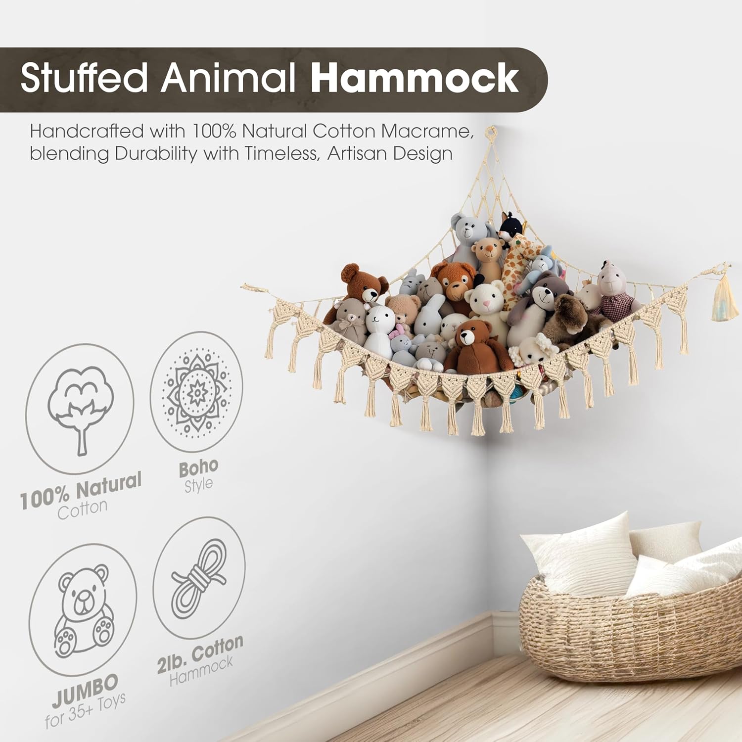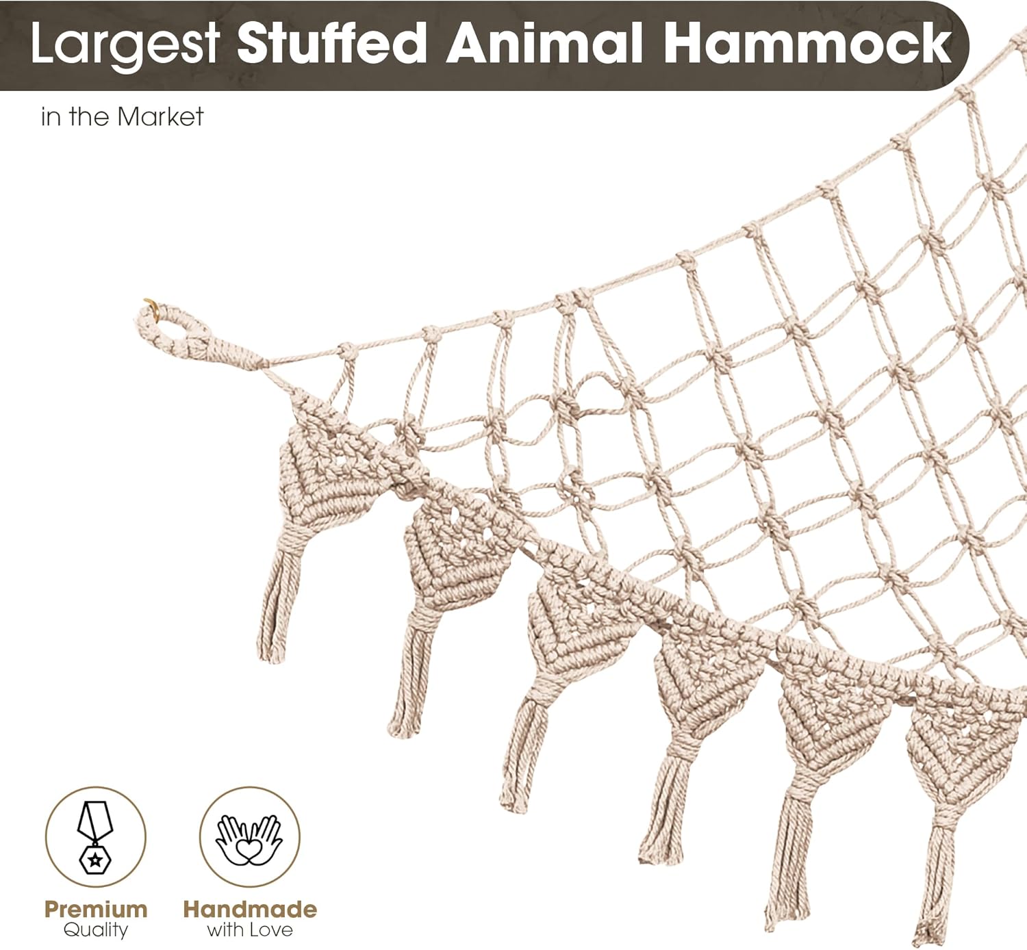 THE ULTIMATE STUFFED ANIMAL NET! Easily hold an entire collection of plushies, bears & stuffed animals in gorgeous style with our Premium Artisan Stuffed Animal Hammock with gorgeous macramé-style woven details & beautiful illuminated LED stars to create the perfect plushie toy wonderland! 100% Cotton & Handmade!