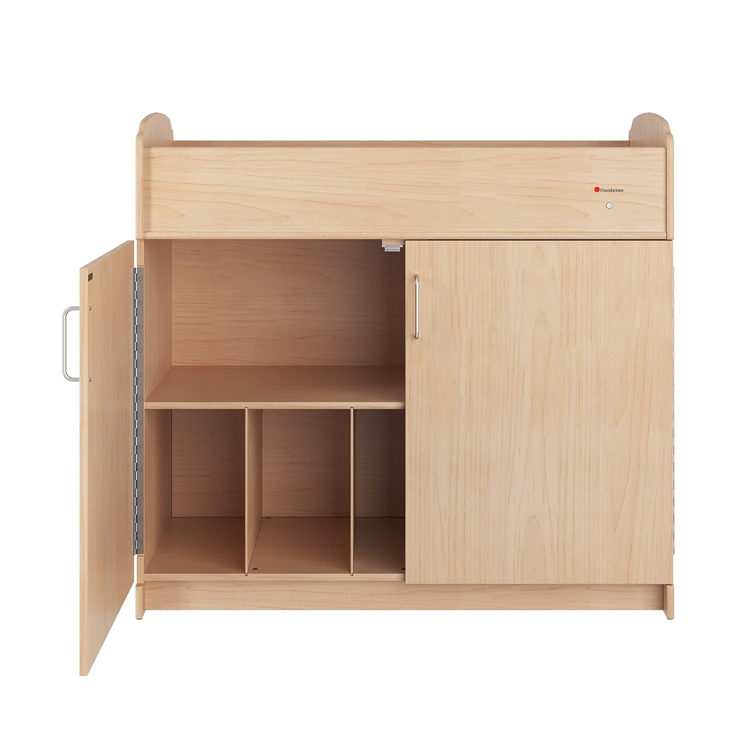 Daycare Changing Table — Foundations Serenity changing table features a clean, natural wood finish and 5 spacious storage cubbies with removable dividers. Changing table can be organized with durable plastic storage containers (# 9501196 sold separately). Changing stations offers plenty of storage for diapers, wipes, clothes and other child care necessities