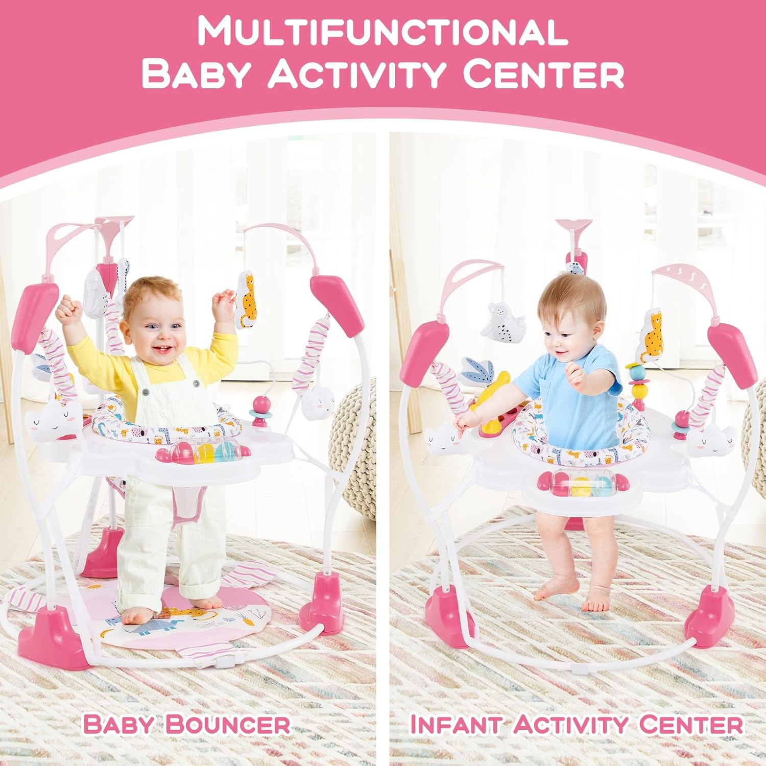Multi-functional Baby Activity Center: The INFANS baby jumper activity center provides a secure, comfortable space to jump, as well as animal plush toys and creative toys to attract baby’s attention. Babies can reach, grasp, bounce, and jump, which helps develop motor skills. This bouncer seat is designed for babies aged 6-12 months