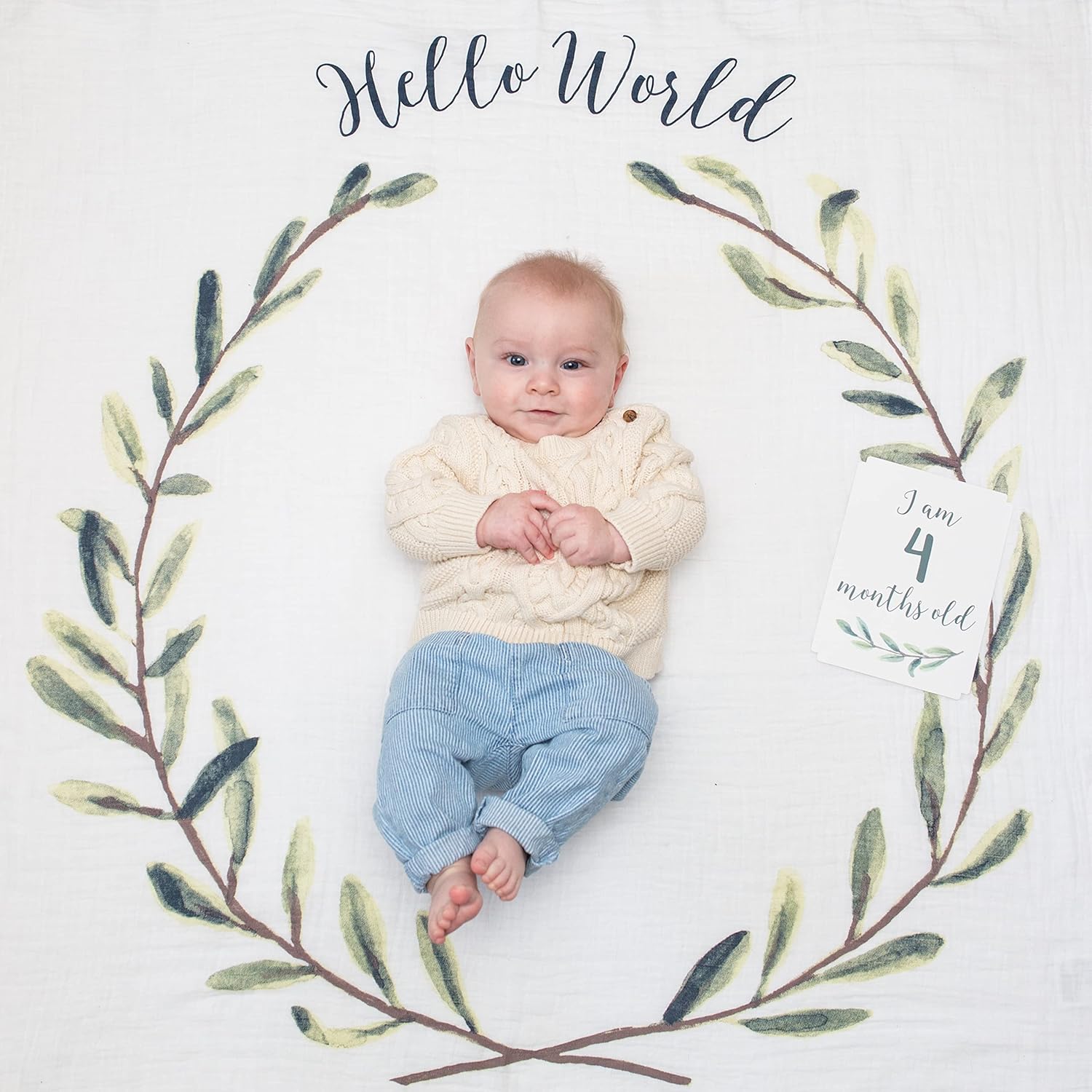 BABY BLANKET AND MILESTONE CARD SET: Ideal props for baby photos, spread muslin blanket as a beautiful backdrop; 7 double-sided cards with 14 milestones show baby’s age from 1 day to 1 year