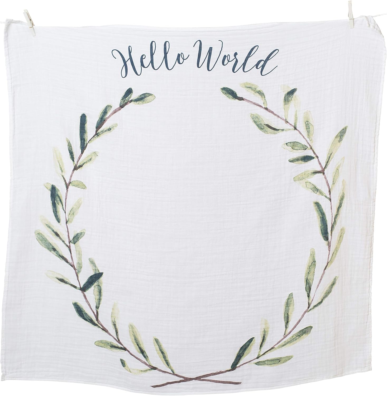 CELEBRATE BABY: 40 x 40-Inch white blanket features elegant laurel wreath, reads: Hello World