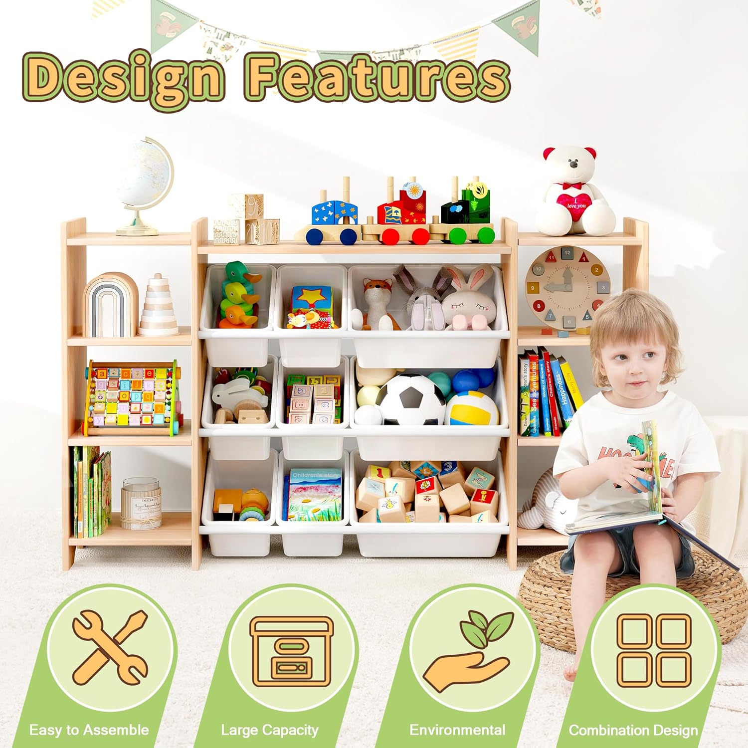 LARGE STORAGE SPACE – The children’s toy storage cabinet has 9 plastic toy storage bins and 3 storage ports.Besides, the topmost wooden board can still be used to store items.Such an extra large storage space allows children to place more things they like, keeping the room clean and tidy, so that children can develop good habits from an early age.