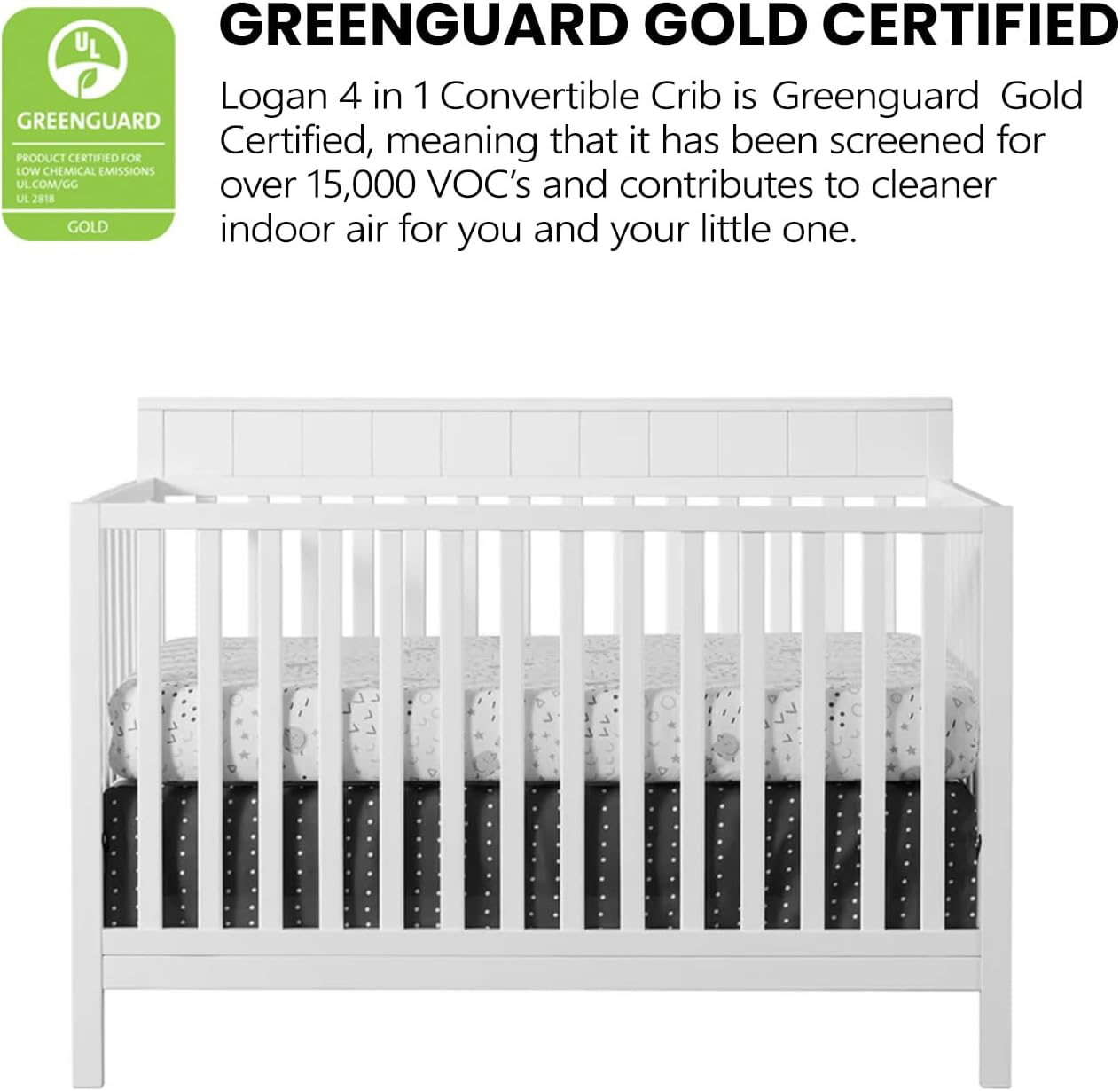 EXQUISITE STYLING: The Logan Crib features simple clean lines, a flat, slatted straight-line headboard with beautifully refined vertical finishing detail, and a smooth to the touch surface