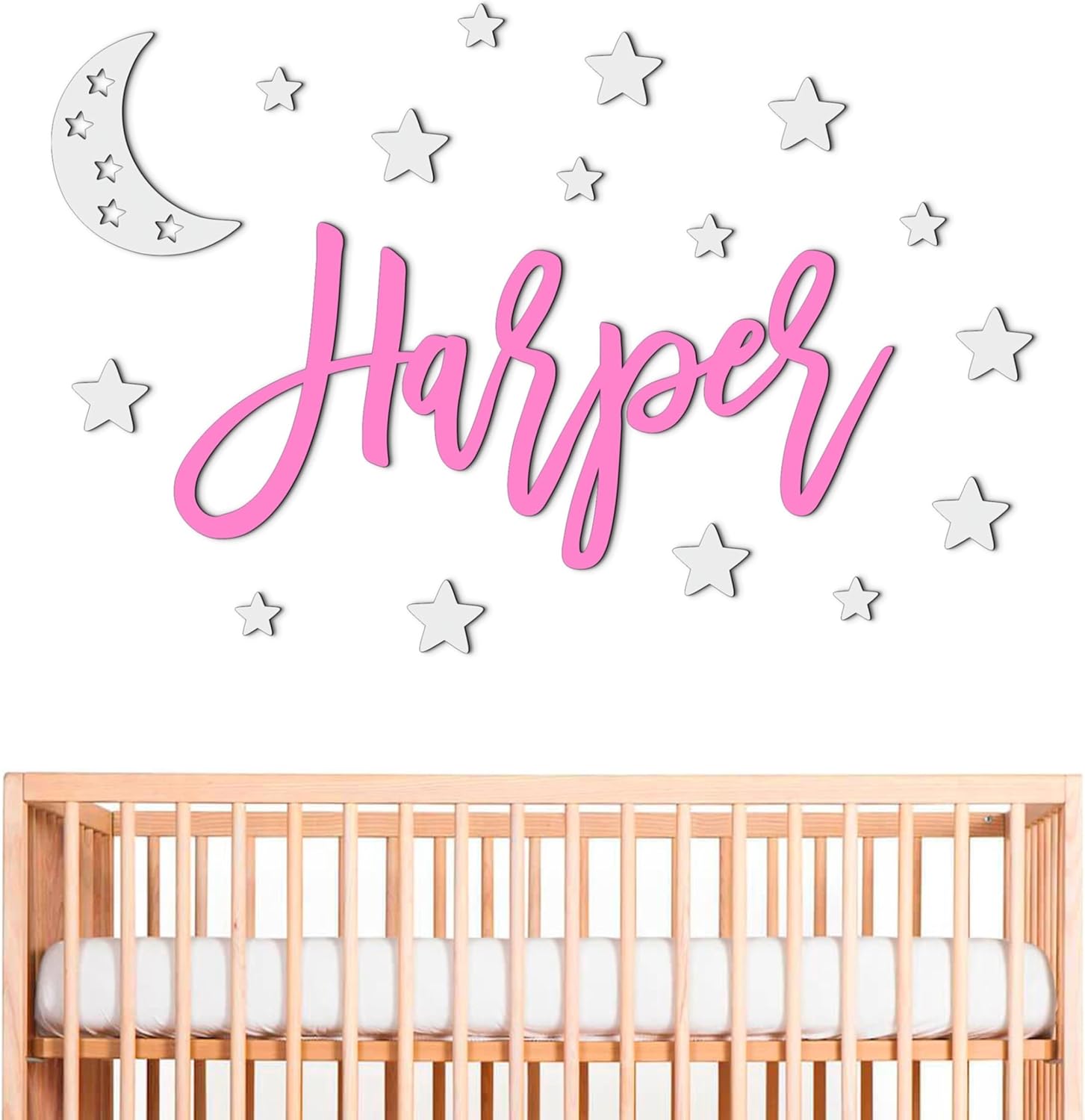 EASY TO MOUNT. Includes high-quality double-sided stickers for easy wall attachment of baby name signs and shapes.